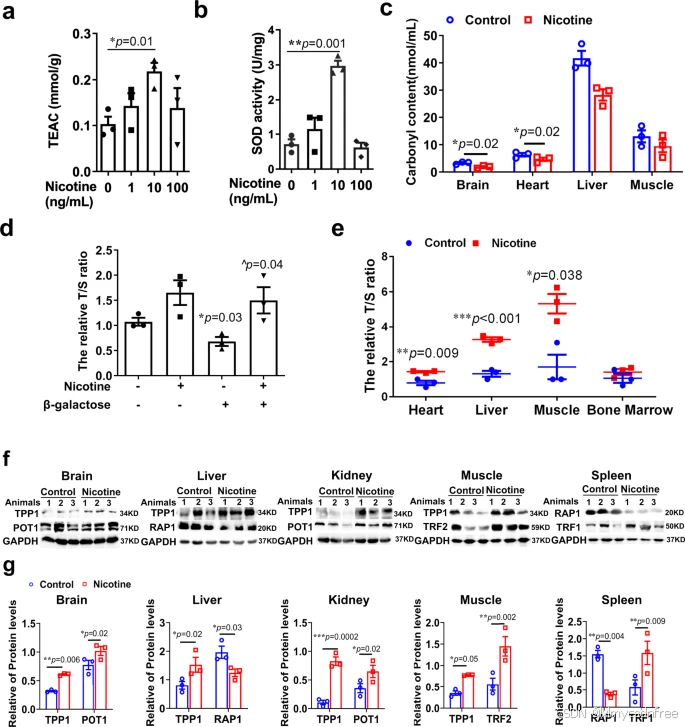 a Nicotine 1, 10, 100 ng/mL regulated trolox-equivalent antioxidant capacity (TEAC) in HT22 cells treatment for 48 h (n = 3 biologically independent samples/group). b Nicotine 1, 10, 100 ng/mL regulated CuZn-Mn superoxide dismutase (CuZn-Mn SOD) activity in HT22 cells for 48 h (n = 3 biologically independent samples/group). c Nicotine decreased the carbonyl content in brain (n = 3, biologically independent samples/group), heart, liver (n = 3, biologically independent samples/group), and muscle of aged mice administered nicotine from 7 to 13 months. d Telomere length/single copy gene (T/S) ratio of β-galactose-induced (n = 3 biologically independent samples/group) aged HT22 cells after nicotine treatment (n = 3, biologically independent samples/group) for 7 days. e Nicotine increased the T/S ratio of heart, liver, muscle and bone marrow in aged mice administered nicotine for 6 months (n = 3, biologically independent samples/group). f Western blot and g were quantification of the telomere shelterin complex of brain, liver, kidney, muscle and spleen after 6 months nicotine administration. Quantification is normalized to GAPDH. Data are means ± SEM. p values were determined by one-way ANOVA with Tukey’s multiple comparisons tests (a, b, d) or two-way ANOVA analysis and Fisher’s least significant difference (c, e, g).