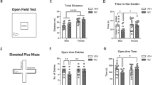 The apparatus was a gray PVC-enclosed arena 50 × 9 × 30 cm, divided into a 10 cm squares. Mice were placed in the center of a novel open field environment. A mouse was placed into a corner square facing the corner and observed for 5 min. Mice were allowed to explore the arena for 10 min, and time spent, distance traveled, and entries into the center (36 cm2 area) of the arena were recorded. The movement of the mouse around the field was recorded with a video tracking device for the entire testing period.
