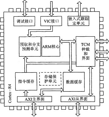Cortex-R4是ARM开发的超标量结构的ARM内核,主要面向实时控制领域,如汽车刹车控制等,这一领域要求处理器响应中断的实时性高,并且要尽可能的节约成本,而很多客户要求不需过多提高工作频率,就能提高运算性能,因此在Cortex-R4的设计过程中,工作频率的最佳点位是300MHz。再高的话,不仅需要高速内存,而且时钟树的设计也更为复杂。结果,判断合理的做法就是采用超标量结构,增加单位周期所执行的指令平均数。Cortex-R4单位工作频率的运算性能为 1.62MIPS(按Dhrystone换算)/MHz,比ARM9的约1.2MIPS/MHz大幅提高。Cortex-R4电路规模只是比ARM9略有增加,但是可以实现更接近于Cortex-A8的运算性能。