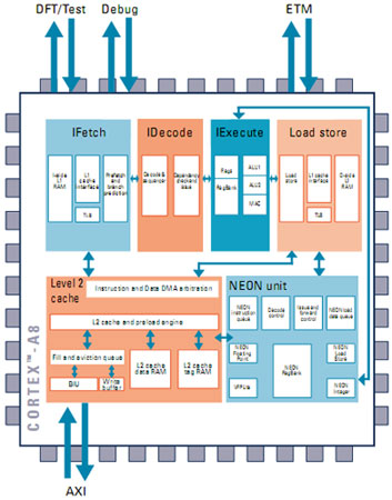 Cortex-A8也是ARM公司第一款超级标量处理器。在该处理器的设计当中,采用了新的技术以提高代码效率和性能,采用了专门针对多媒体和信号处理的NEON技术。同时,还采用了Jazelle RCT技术,可以支持JAVA程序的预编译与实时编译。