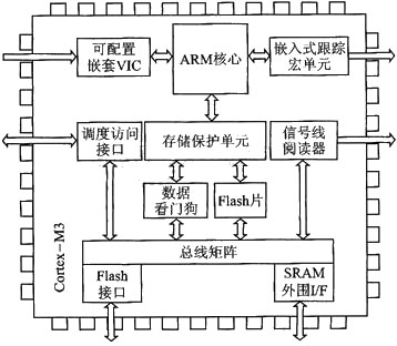 Cortex-M3的速度比ARM7快三分之一,功耗低四分之三,并且能实现更小芯片面积,利于将更多功能整合在更小的芯片尺寸中。Cortex-M3处理器结合了执行Thumb-2指令的32位哈佛微体系结构和系统外设,包括Nested Vec-tored Interrupt Controller和Arbiter总线。该技术方案在测试和实例应用中表现出较高的性能:在台机电180 nm工艺下,芯片性能达1.2 DMIPS/MHz,时钟频率高达100 MHz。