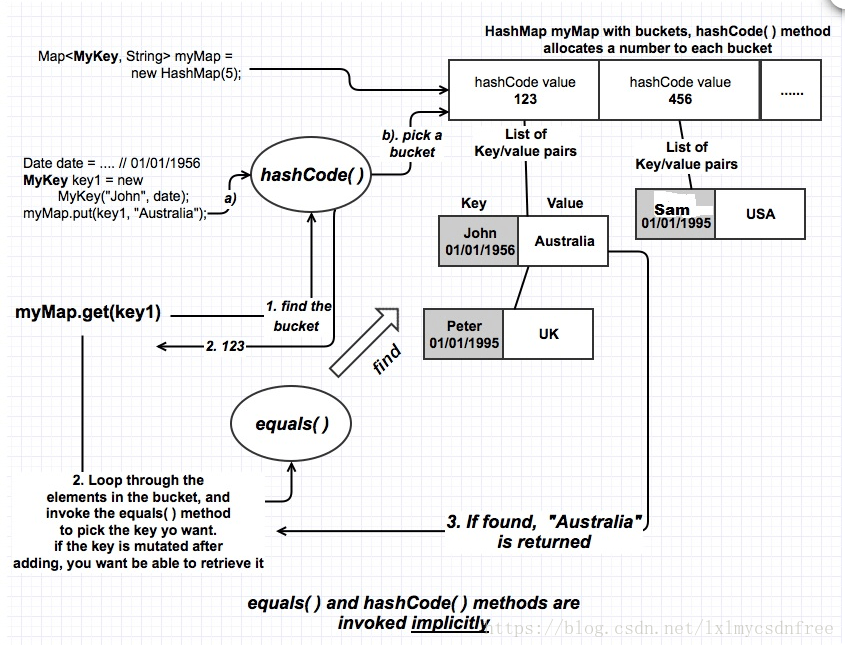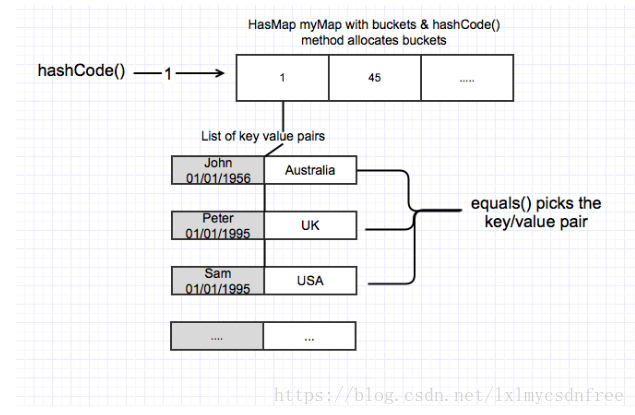 1)使用键(key)和值(value)将一个对象放入 map 中时,会隐式调用 hashCode() 方法,返回哈希值(hash code value),比如 123。两个不同的键能够返回一样的哈希值。良好的哈希算法(hashing algorithm)能够将数值分散开。在上面的例子中,我们假设 (“John”,01/01/1956) 的键和 (“Peter”, 01/01/1995) 的键返回相同的哈希值,都是 123。