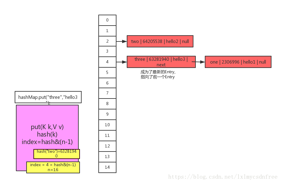 //在table[i]的地方添加一个包含hash,key,value信息的Entry类。