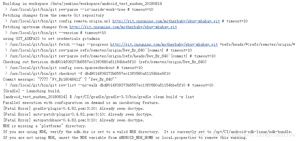 再次构建,爆出找不到ndk,但是由于android代码没有使用到ndk,所有jenkins JOB可以正常编译。