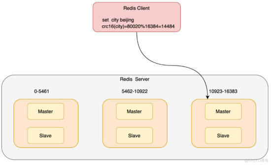 这里的CRC16(city)%16384可以简单的理解为将key1根据CRC16算法取hash值然后对slot个数取模,得到的就是slot位置为14484,他所对应的实例节点是第三个。