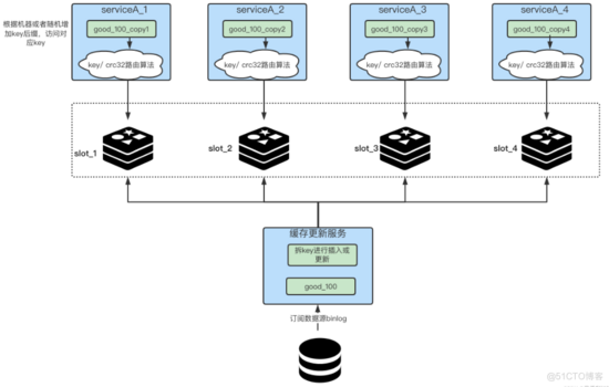 例如:我们在放入缓存时就将对应业务的缓存key拆分成多个不同的key。如下图所示,我们首先在更新缓存的一侧,将key拆成N份,比如一个key名字叫做”good_100”,那我们就可以把它拆成四份,“good_100_copy1”、“good_100_copy2”、“good_100_copy3”、“good_100_copy4”,每次更新和新增时都需要去改动这N个key,这一步就是拆key。
