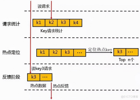 对于热点数据的发现,首先会在一个周期内对 Key 进行请求统计,在达到请求量级后会对热点 Key 进行热点定位,并将所有的热点 Key 放入一个小的 LRU 链表内,在通过 Proxy 请求进行访问时,若 Redis 发现待访点是一个热点,就会进入一个反馈阶段,同时对该数据进行标记。