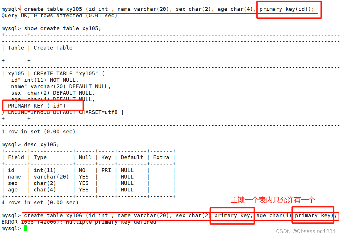 create table 表名 (.... primary key (字段));