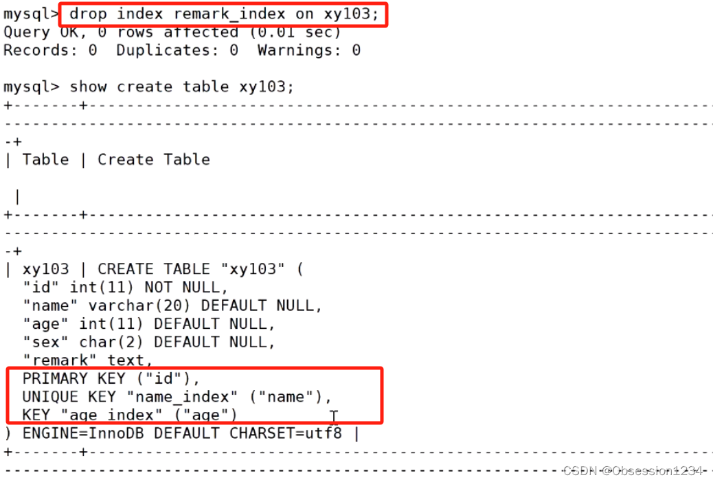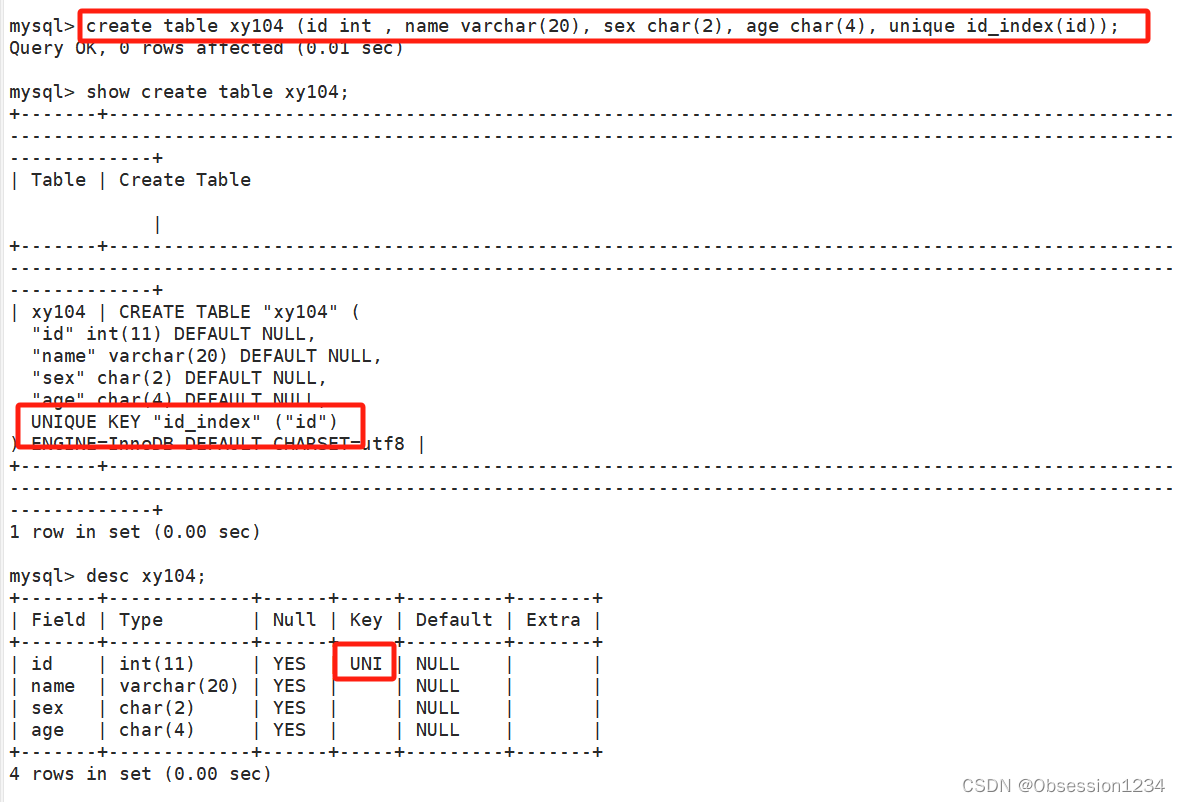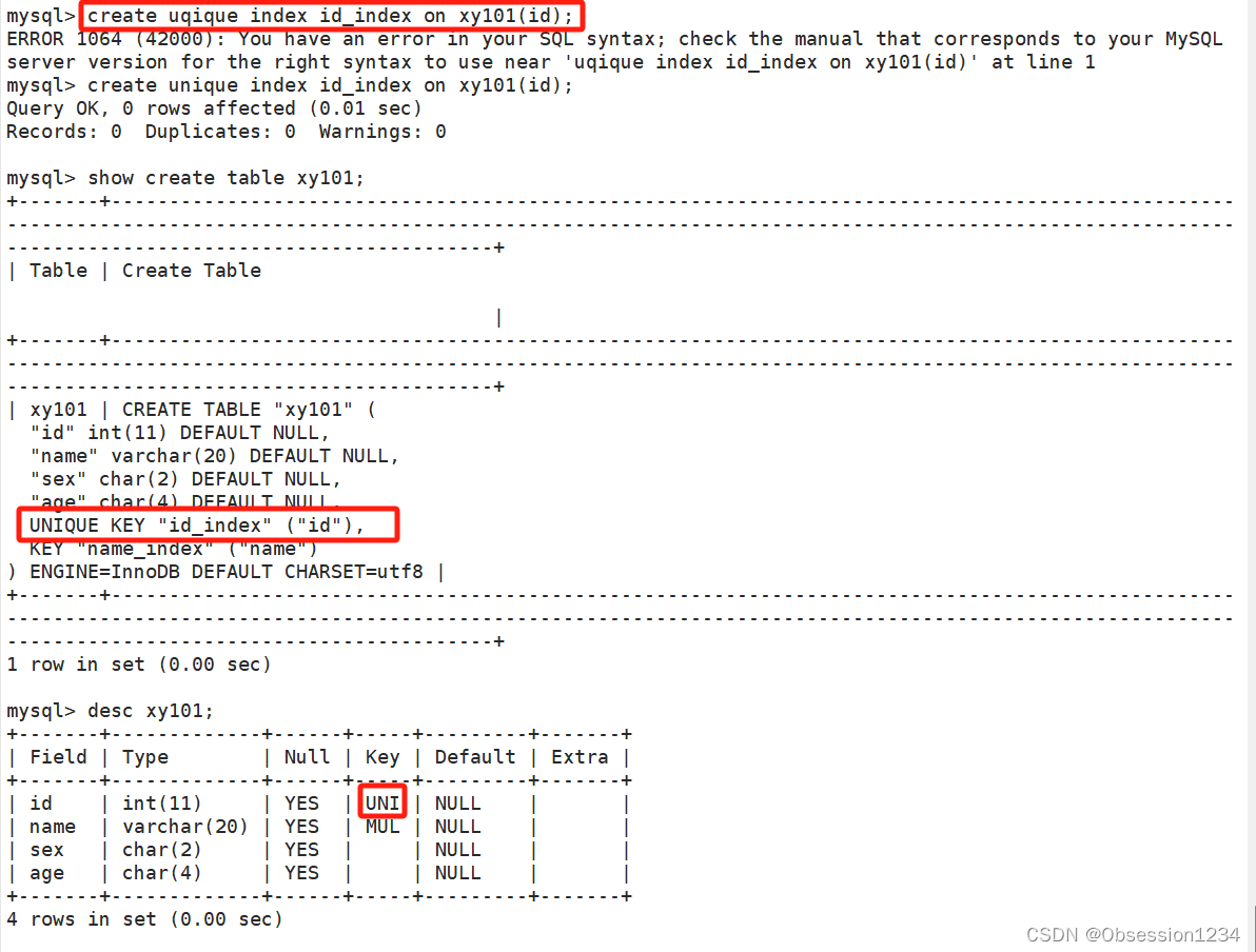 create table 表名 (...., unique 索引名(字段)); #创建表创建