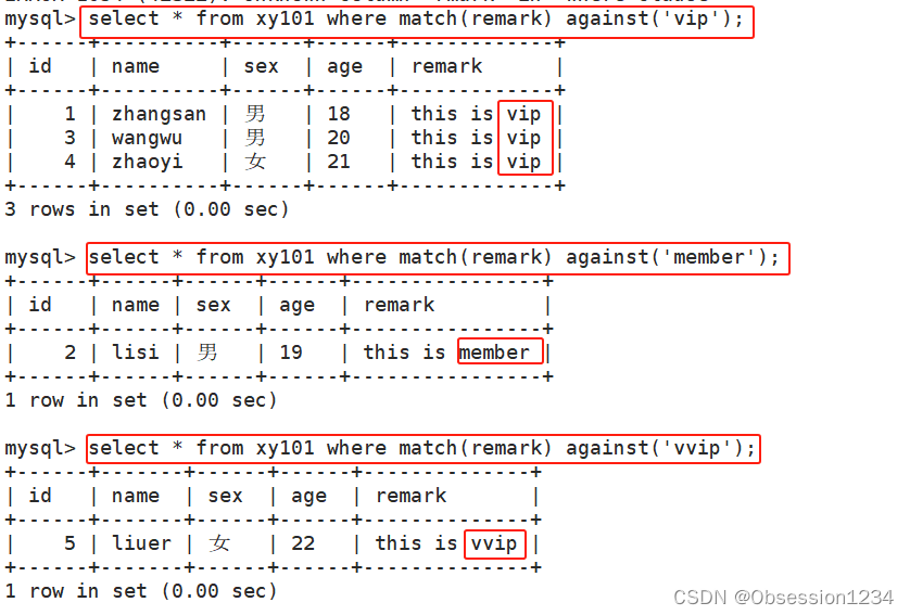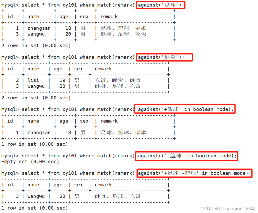 select 字段列表 from 表名 where match(字段) against('单词1 单词2' IN BOOLEAN MODE);