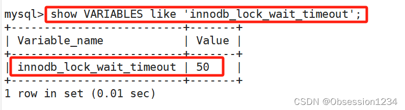 在 InnoDB 存储引擎中,参数 innodb_lock_wait_timeout 是用来设置超时时间的,默认值为 50 秒。 show VARIABLES like 'innodb_lock_wait_timeout';