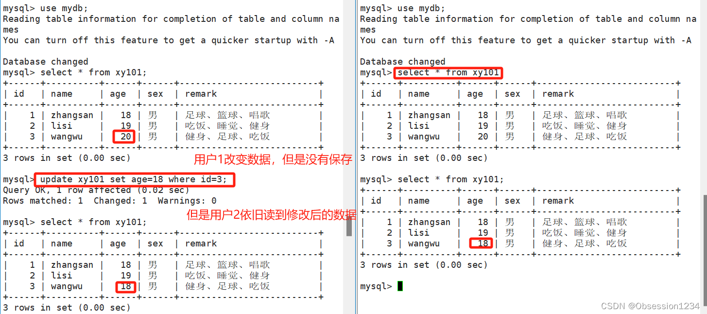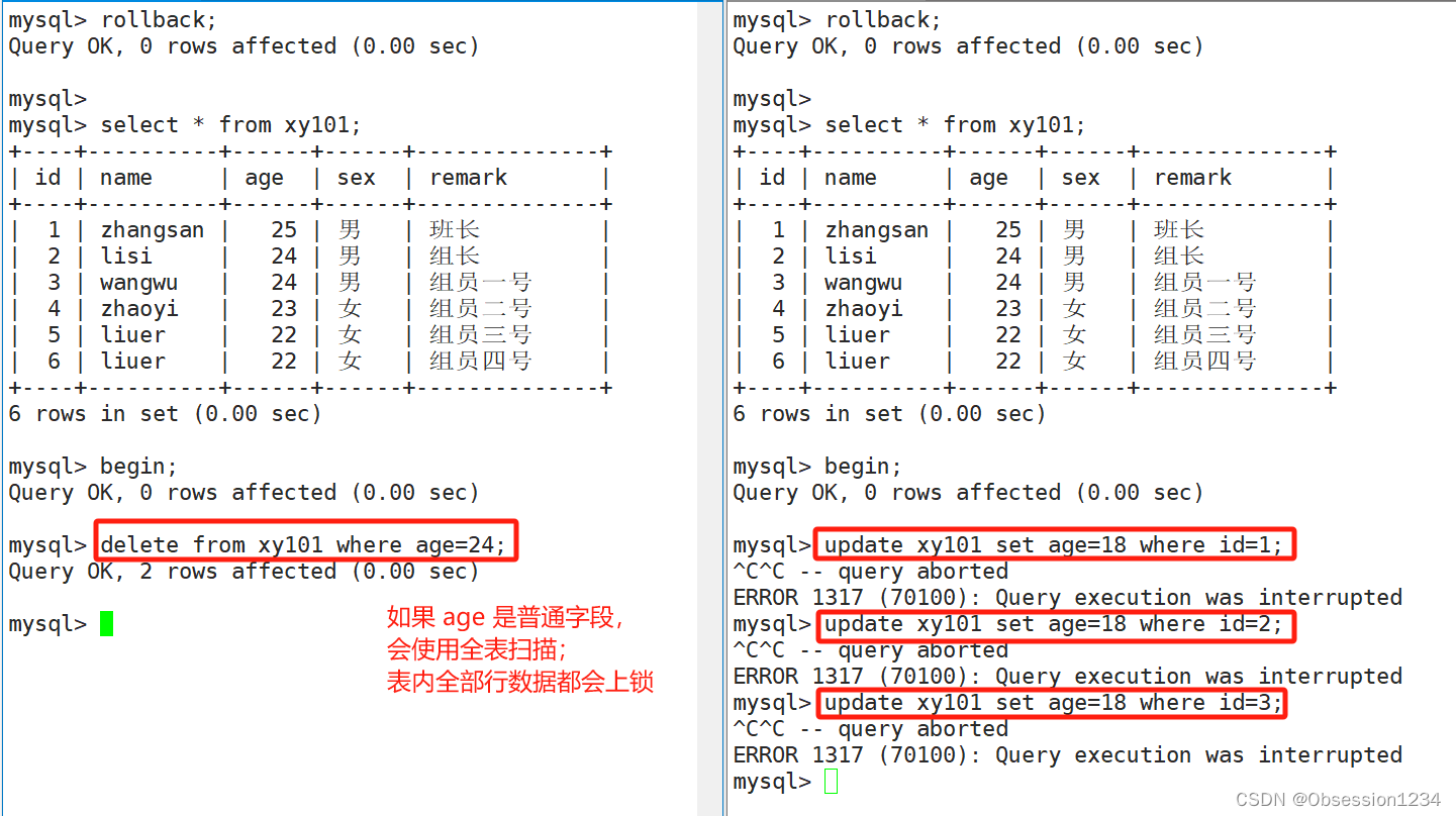 (3)如果age字段没有索引,会使用全表扫描过滤,这时表上的各行记录都将加上锁。