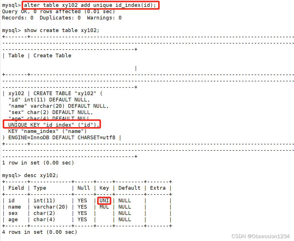 alter table 表名 add unique 索引名(字段(长度)); #修改表创建