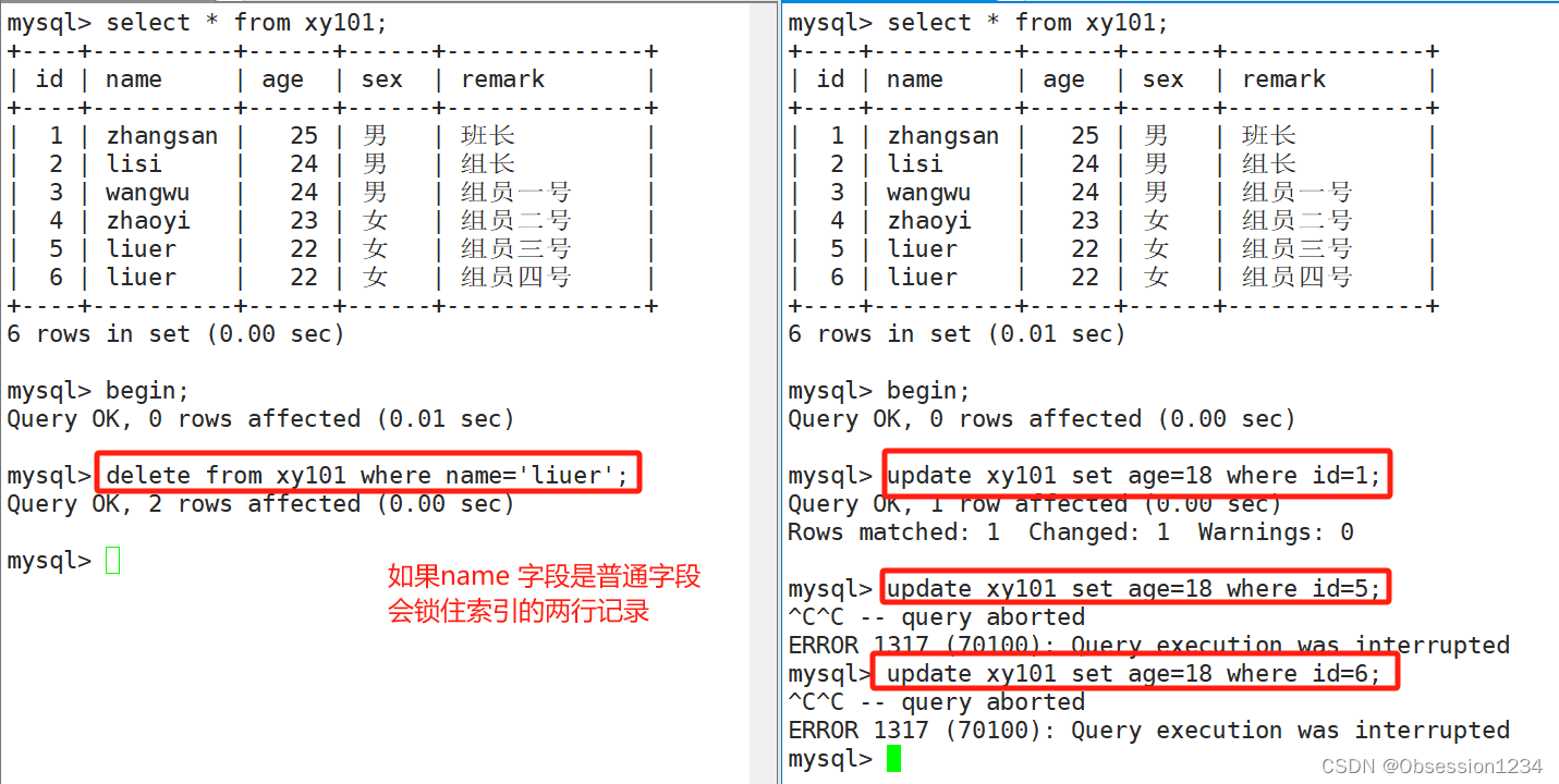 (2)如果name字段是普通索引,会锁住索引的两行记录。