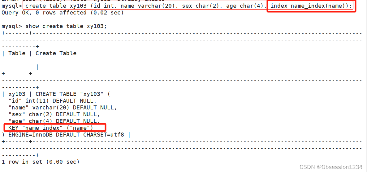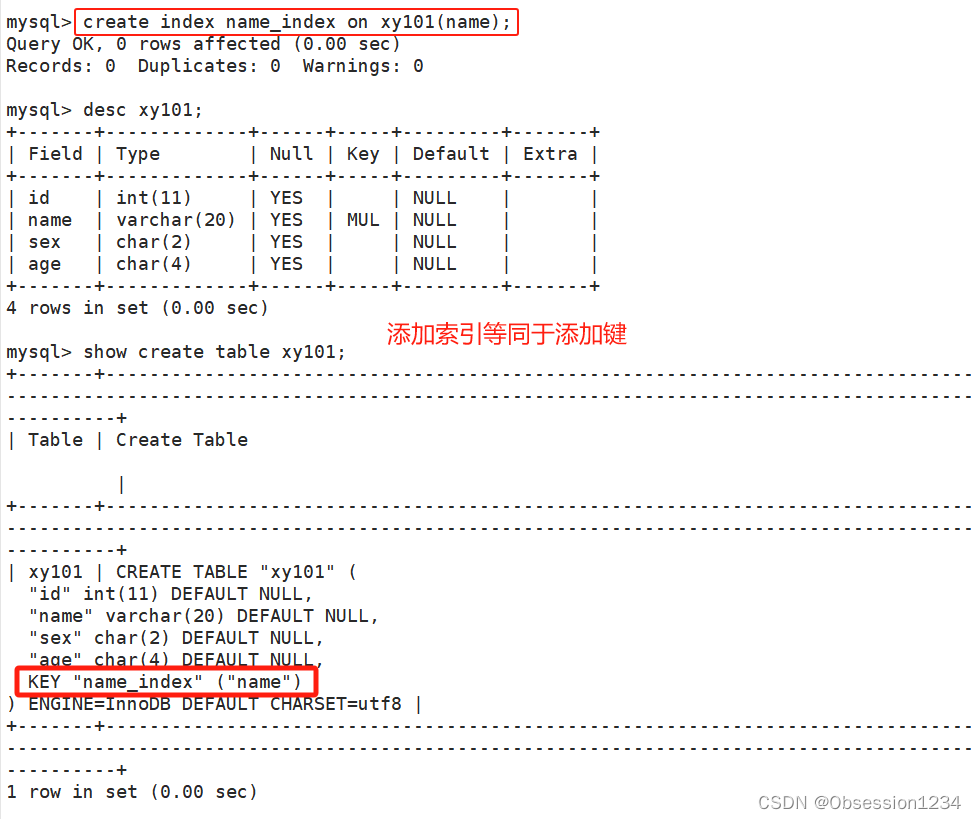 create table 表名 (...., index 索引名(字段)); #创建表时添加