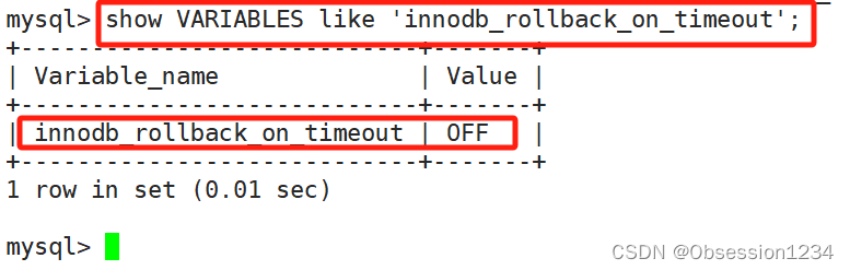 参数 innodb_rollback_on_timeout 表示是否在等待超时时对进行中的事务进行回滚操作(默认是OFF,代表不回滚)。