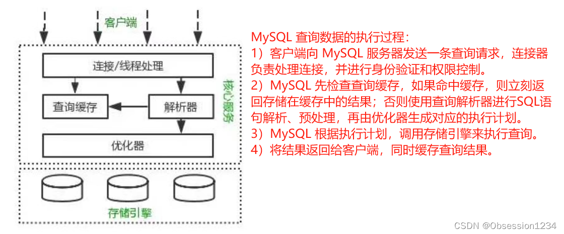 (2) MySQL 服务器首先检查查询缓存,如果命中缓存,则立刻返回存储在缓存中的结果,否则使用查询解析器进行SQL语句解析、预处理、再由优化器生成对应的执行计划