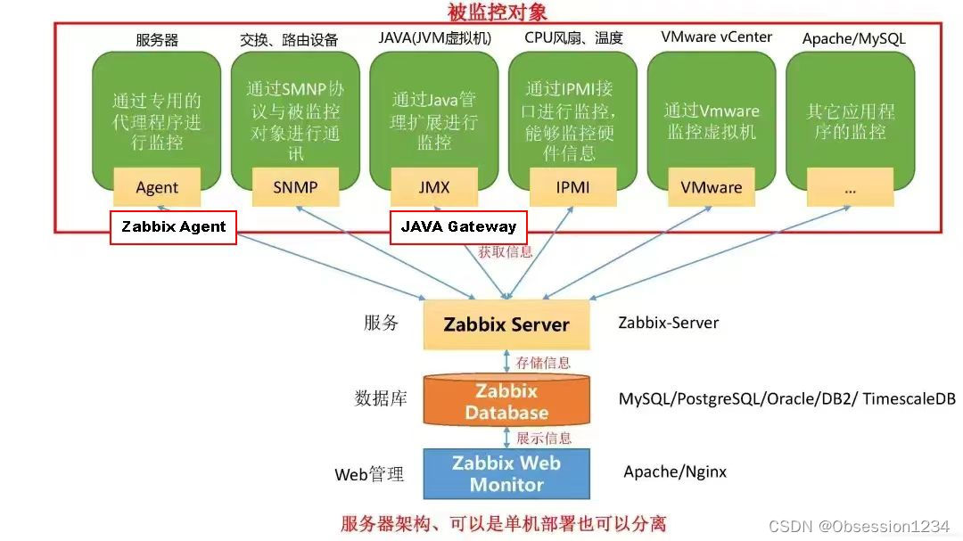 (4)zabbix server 可以通过 zabbix agent,SNMP协议,端口监视等方法提供对远程服务器/网络