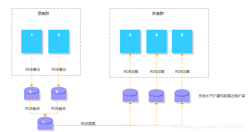 为了不影响生产系统的使用,会采用离线数据迁移,先将RDB所有备份的数据,融合到C中转机里,再重新写至新扩容的集群机器中。