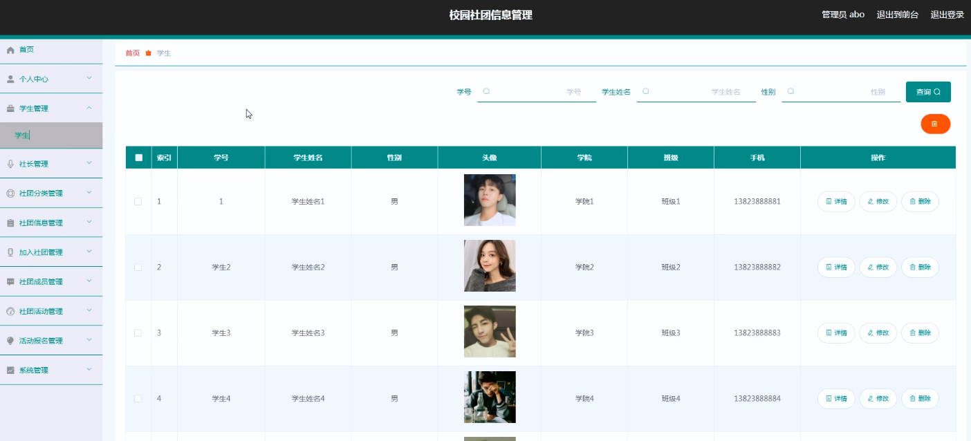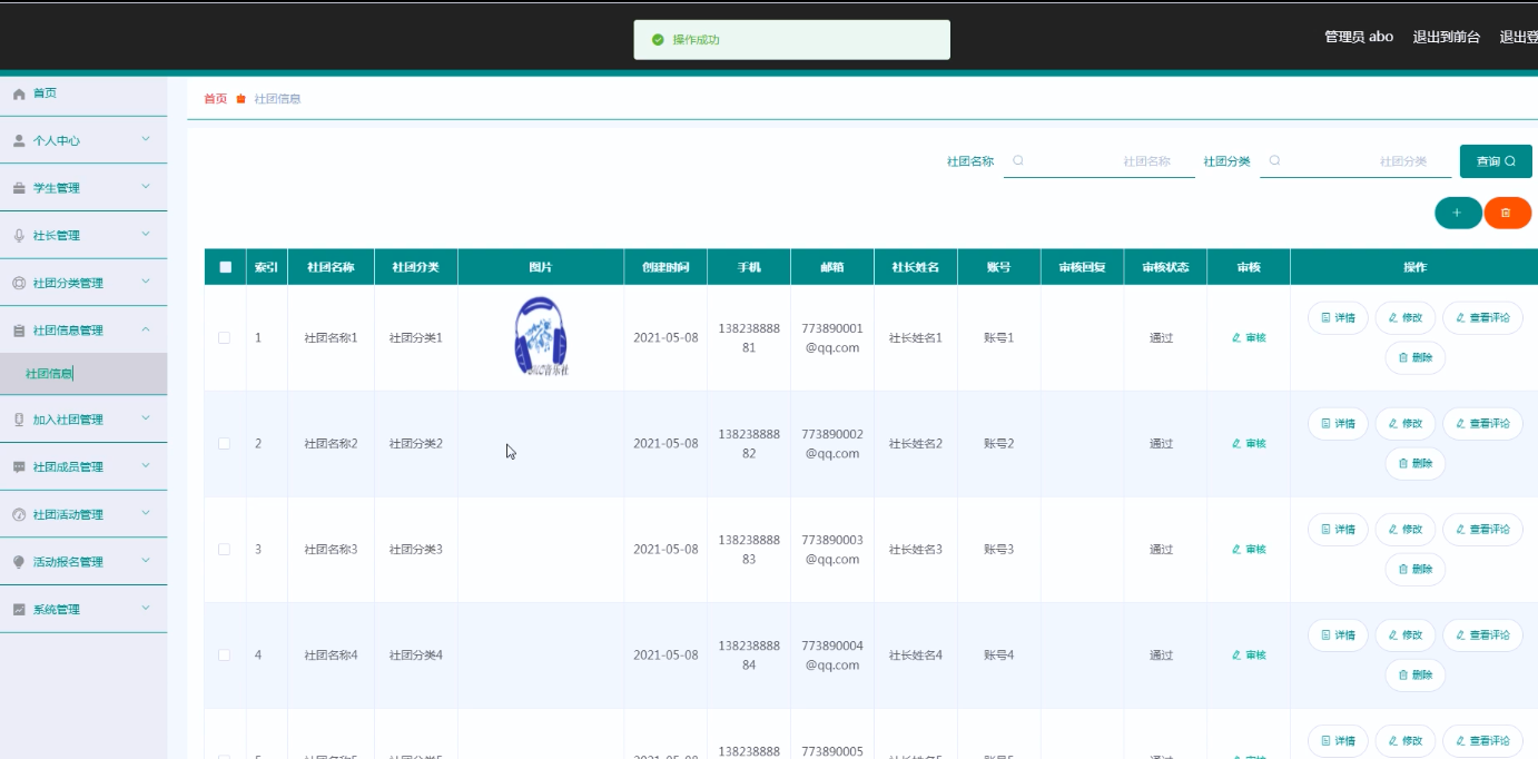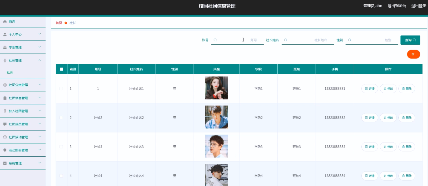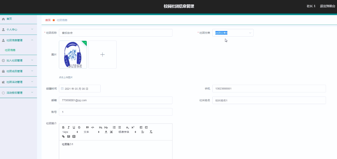 The administrator functions of the campus club information management system include personal center, student management, president management, club classification management, club information management, joining club management, club member management, club activity management, event registration management, system management, etc. The president adds a club, the administrator reviews the club, students join the club, and the president reviews the club. So it has a certain practicability.