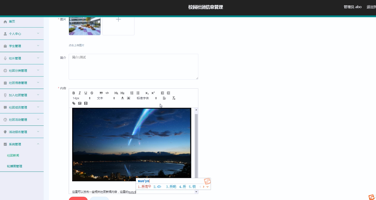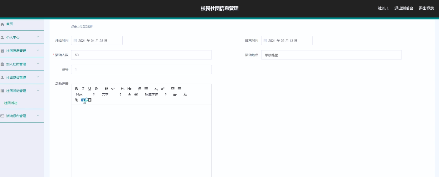 社长创建社团活动,等待管理员审核。界面如下图所示: