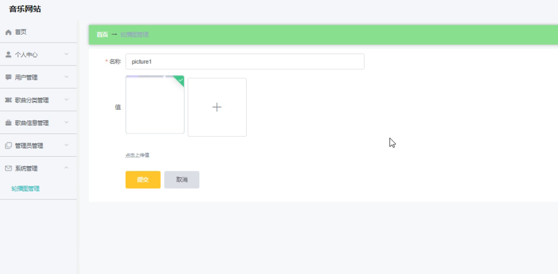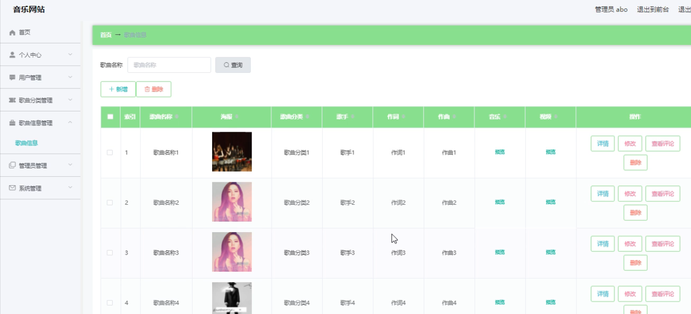 The administrator functions of this music website include personal center, user management, song classification management, song information management, administrator management, system management, etc. Users can register and log in, listen to songs, and download songs. So it has a certain practicability.