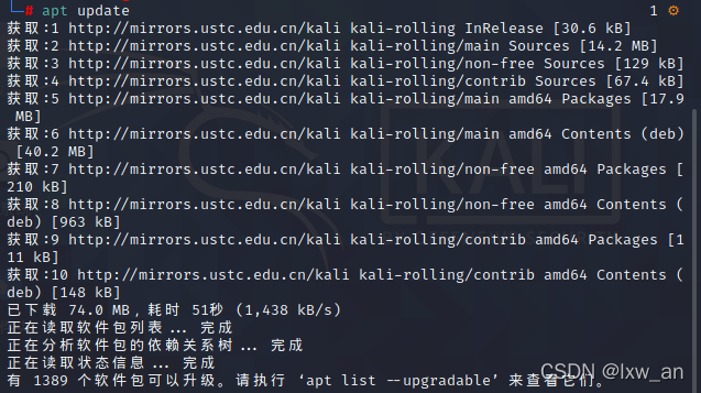 发现已经在使用中科大的 kali 源了,最后使用apt full-upgrade -y进行更新系统。