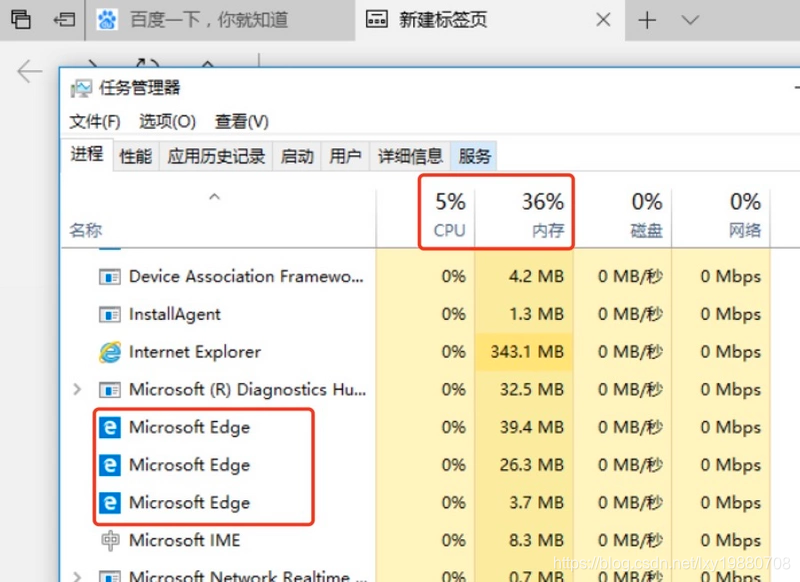 当然,浏览器有时会将多个进程合并(譬如打开多个空白标签页后,会发现多个空白标签页被合并成了一个进程),如图