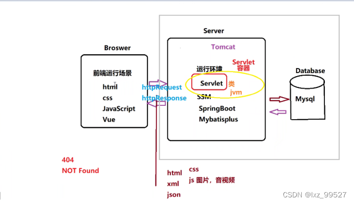 昨天我们已经初步了解b/s架构,简单来说B就是Browser是浏览器,前端运行场景(Html css JavaScript Vue) ,而S是Servlet服务器运行环境 Servlet SSM SpringBoot Mybatisplus。是一种架构模式。而B/S架构是易于维护升级的。服务器与客户端的三种传输格式 : html,xml,json。