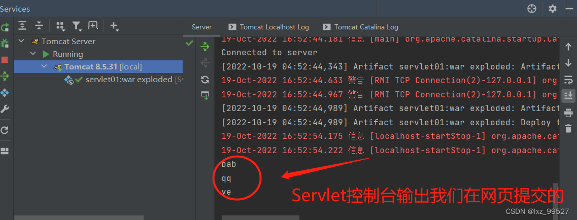 器访问后,在控制台会打印 servlet hello world~ 说明servlet程序已经成功运行。