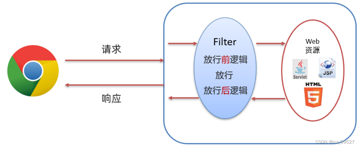 拦截之前浏览器可以访问服务器上的所有资源,而有了过滤器后在客户端访问服务器的时候,要经过过滤器,从而把一些功能进行操作。