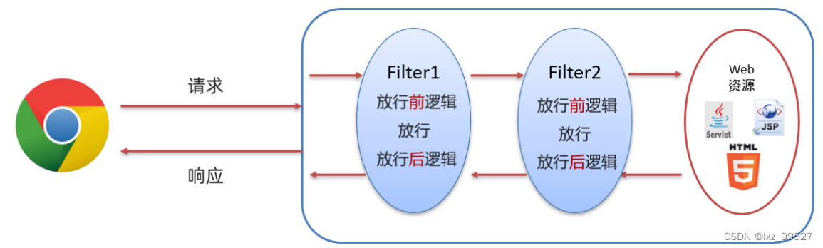 上图中的过滤器链执行是按照以下流程执行:1. 执行 Filter1 的放行前逻辑代码2. 执行 Filter1 的放行代码3. 执行 Filter2 的放行前逻辑代码4. 执行 Filter2 的放行代码5. 访问到资源6. 执行 Filter2 的放行后逻辑代码7. 执行 Filter1 的放行后逻辑代码以上流程串起来就像一条链子,故称之为过滤器链