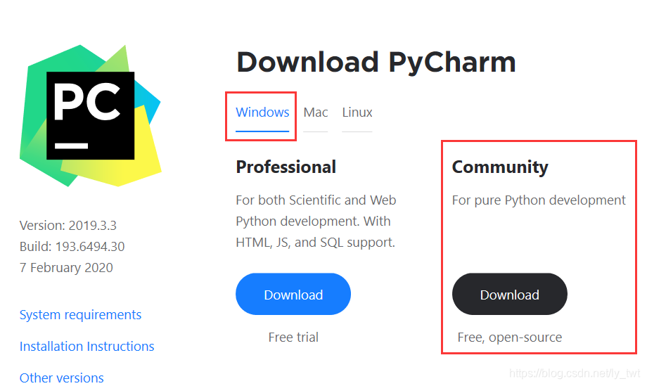 pycharm下载地址:https://www.jetbrains.com/pycharm/download/#section=windows
