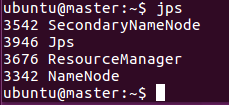 可看到master节点:Jps、NameNode、SecondNameNode、ResourceManager