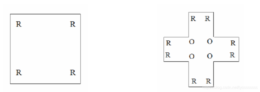 我们可以发现,如果我们把一个多边形分成四份,即左上,右上,左下和右下,每一部分都是由形如RORO……ROR的样式,因此在总共的序列中R比O一定多了4个。因此我们可以算出R共有(n+4)/2个,O共有(n-4)/2个。进一步我们发现序列中的O是不会相邻的,否则一定不会构成一个封闭图形,因此我们可以利用排列组合算出答案,先将R排好,然后将O插入到R形成的空中,共有(n+4)/2+1个空,然后再去掉首尾都是O的情况,最终答案为: