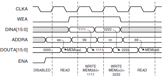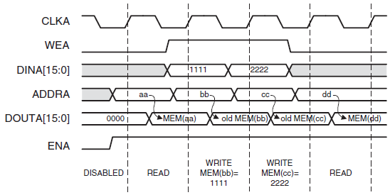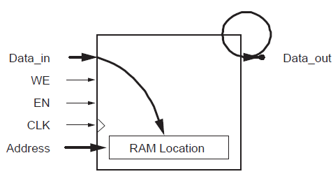 - 写入的数据写到RAM内核。输出端口的数据(实际上有个寄存器)保持不变。