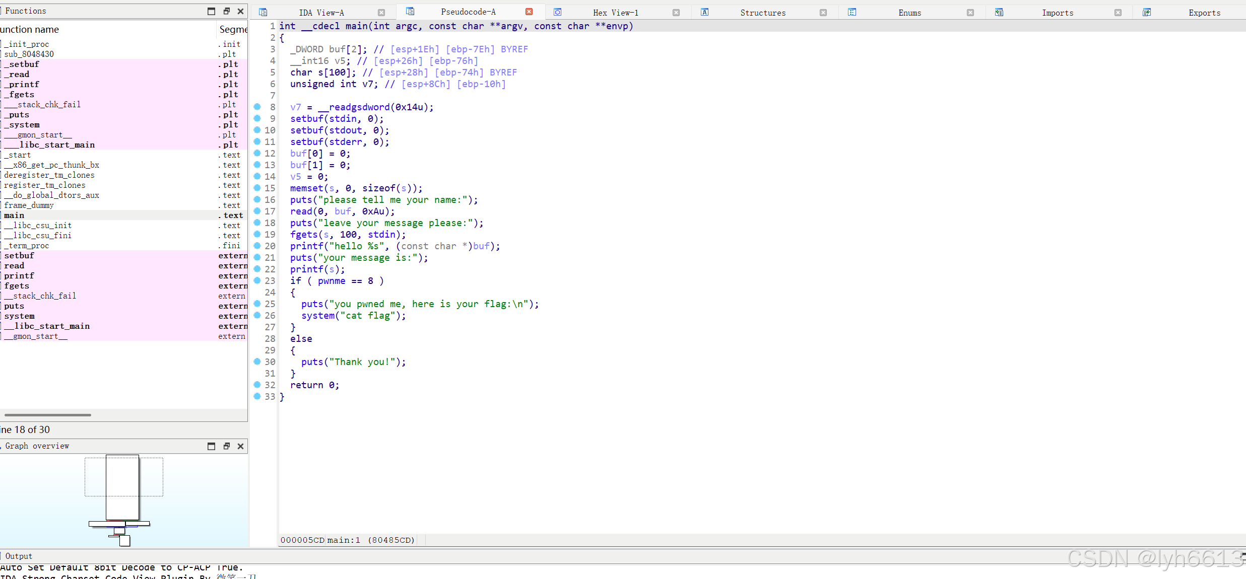 我们可以看出这个字符buf和s,是作为名字和信息的;如果pwnme==8,则输出flag值。