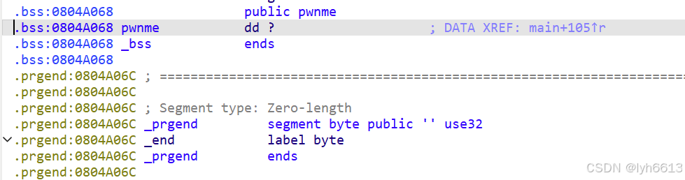 确定目标全局变量pwnme 的地址 target_address 了,IDA 中给出了地址 0x0804A068,因为没有 PIE 保护,所以 IDA 所展示的地址即是程序运行时所用的地址。