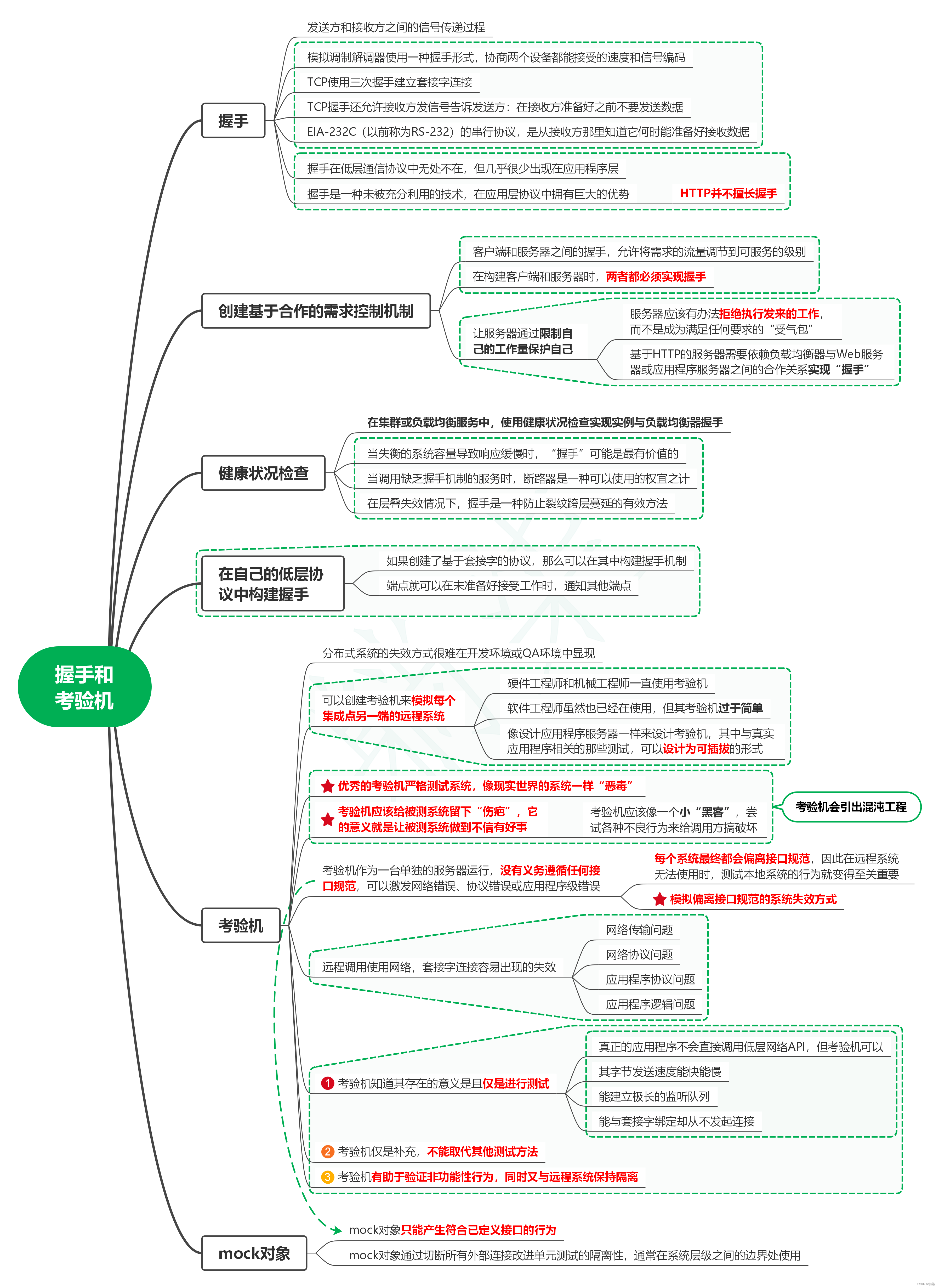 1. 握手 1.1. 发送方和接收方之间的信号传递过程 1.2. 模拟调制解调器使用一种握手形式,协商两个设备都能接受的速度和信号编码 1.3. TCP使用三次握手建立套接字连接 1.4. TCP握手还允许接收方发信号告诉发送方:在接收方准备好之前不要发送数据 1.5. EIA-232C(以前称为RS-232)的串行协议,是从接收方那里知道它何时能准备好接收数据 1.6. 握手在低层通信协议中无处不在,但几乎很少出现在应用程序层 1.7. 握手是一种未被充分利用的技术,在应用层协议中拥有巨大的优势 1.7.1. HTTP并不擅长握手 2. 创建基于合作的需求控制机制 2.1. 客户端和服务器之间的握手,允许将需求的流量调节到可服务的级别 2.2. 在构建客户端和服务器时,两者都必须实现握手 2.3. 让服务器通过限制自己的工作量保护自己 2.3.1. 服务器应该有办法拒绝执行发来的工作,而不是成为满足任何要求的“受气包” 2.3.2. 基于HTTP的服务器需要依赖负载均衡器与Web服务器或应用程序服务器之间的合作关系实现“握手” 3. 健康状况检查 3.1. 在集群或负载均衡服务中,使用健康状况检查实现实例与负载均衡器握手 3.2. 当失衡的系统容量导致响应缓慢时,“握手”可能是最有价值的 3.3. 当调用缺乏握手机制的服务时,断路器是一种可以使用的权宜之计 3.4. 在层叠失效情况下,握手是一种防止裂纹跨层蔓延的有效方法 4. 在自己的低层协议中构建握手 4.1. 如果创建了基于套接字的协议,那么可以在其中构建握手机制 4.2. 端点就可以在未准备好接受工作时,通知其他端点 5. 考验机 5.1. 分布式系统的失效方式很难在开发环境或QA环境中显现 5.2. 可以创建考验机来模拟每个集成点另一端的远程系统 5.2.1. 硬件工程师和机械工程师一直使用考验机 5.2.2. 软件工程师虽然也已经在使用,但其考验机过于简单 5.2.3. 像设计应用程序服务器一样来设计考验机,其中与真实应用程序相关的那些测试,可以设计为可插拔的形式 5.3. 优秀的考验机严格测试系统,像现实世界的系统一样“恶毒” 5.4. 考验机应该给被测系统留下“伤疤”,它的意义就是让被测系统做到不信有好事 5.4.1. 考验机应该像一个小“黑客”,尝试各种不良行为来给调用方搞破坏 5.5. 考验机会引出混沌工程 5.6. 考验机作为一台单独的服务器运行,没有义务遵循任何接口规范,可以激发网络错误、协议错误或应用程序级错误 5.6.1. 每个系统最终都会偏离接口规范,因此在远程系统无法使用时,测试本地系统的行为就变得至关重要 5.6.2. 模拟偏离接口规范的系统失效方式 5.7. 远程调用使用网络,套接字连接容易出现的失效 5.7.1. 网络传输问题 5.7.2. 网络协议问题 5.7.3. 应用程序协议问题 5.7.4. 应用程序逻辑问题 5.8. 考验机知道其存在的意义是且仅是进行测试 5.8.1. 真正的应用程序不会直接调用低层网络API,但考验机可以 5.8.2. 其字节发送速度能快能慢 5.8.3. 能建立极长的监听队列 5.8.4. 能与套接字绑定却从不发起连接 5.9. 考验机仅是补充,不能取代其他测试方法 5.10. 考验机有助于验证非功能性行为,同时又与远程系统保持隔离 6. mock对象 6.1. mock对象只能产生符合已定义接口的行为 6.2. mock对象通过切断所有外部连接改进单元测试的隔离性,通常在系统层级之间的边界处使用