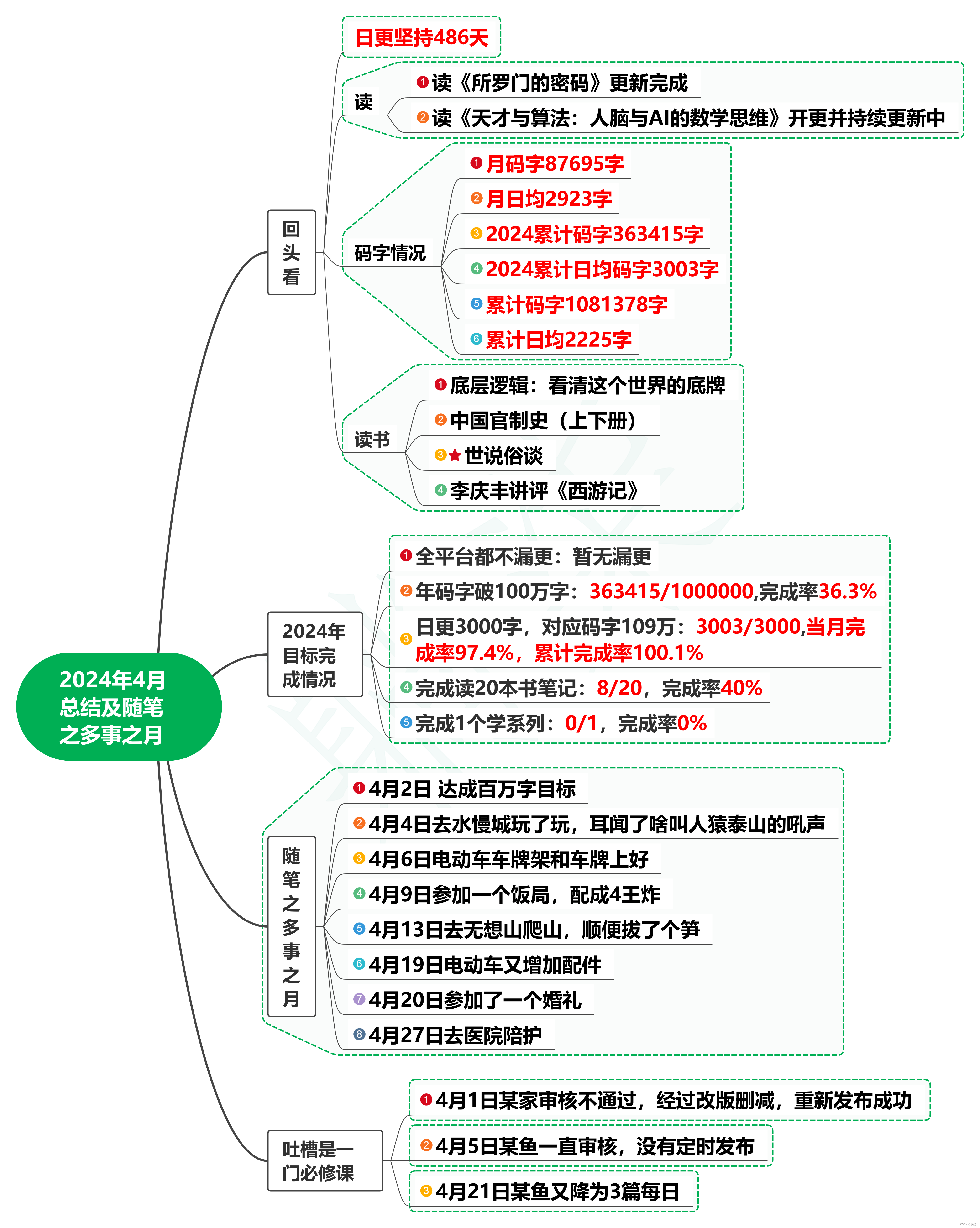 2024年4月码字87695字,同比增长52.5%,环比下降7.5%,日均码字数2923字,累计码字363415字,累积日均码字3003字。