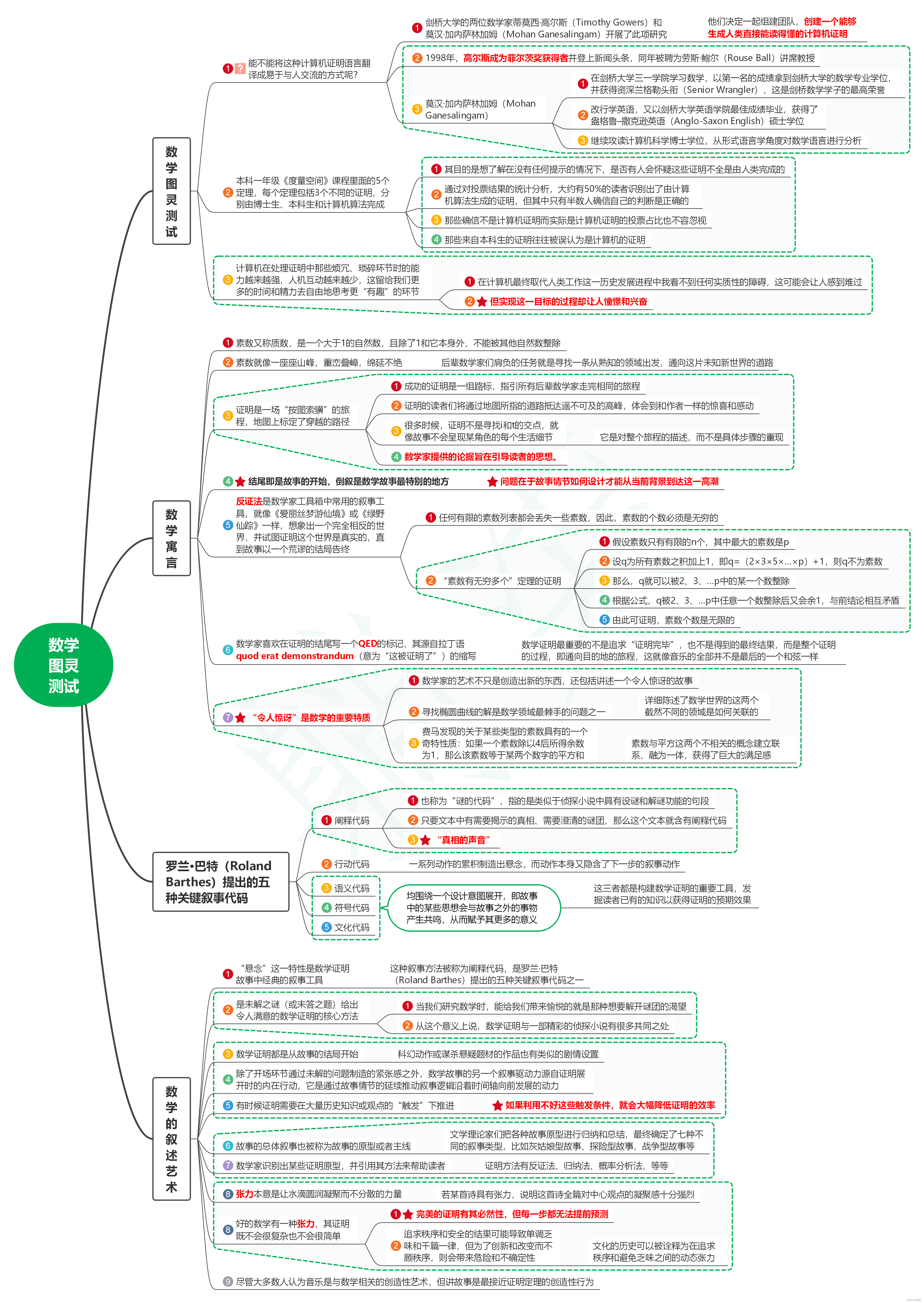 1. 数学图灵测试 1.1. 能不能将这种计算机证明语言翻译成易于与人交流的方式呢? 1.1.1. 剑桥大学的两位数学家蒂莫西·高尔斯(Timothy Gowers)和莫汉·加内萨林加姆(Mohan Ganesalingam)开展了此项研究 1.1.1.1. 他们决定一起组建团队,创建一个能够生成人类直接能读得懂的计算机证明 1.1.2. 1998年,高尔斯成为菲尔茨奖获得者并登上新闻头条,同年被聘为劳斯·鲍尔(Rouse Ball)讲席教授 1.1.3. 莫汉·加内萨林加姆(Mohan Ganesalingam) 1.1.3.1. 在剑桥大学三一学院学习数学,以第一名的成绩拿到剑桥大学的数学专业学位,并获得资深兰格勒头衔(Senior Wrangler),这是剑桥数学学子的最高荣誉 1.1.3.2. 改行学英语,又以剑桥大学英语学院最佳成绩毕业,获得了盎格鲁–撒克逊英语(Anglo-Saxon English)硕士学位 1.1.3.3. 继续攻读计算机科学博士学位,从形式语言学角度对数学语言进行分析 1.2. 本科一年级《度量空间》课程里面的5个定理,每个定理包括3个不同的证明,分别由博士生、本科生和计算机算法完成 1.2.1. 其目的是想了解在没有任何提示的情况下,是否有人会怀疑这些证明不全是由人类完成的 1.2.2. 通过对投票结果的统计分析,大约有50%的读者识别出了由计算机算法生成的证明,但其中只有半数人确信自己的判断是正确的 1.2.3. 那些确信不是计算机证明而实际是计算机证明的投票占比也不容忽视 1.2.4. 那些来自本科生的证明往往被误认为是计算机的证明 1.3. 计算机在处理证明中那些烦冗、琐碎环节时的能力越来越强,人机互动越来越少,这留给我们更多的时间和精力去自由地思考更“有趣”的环节 1.3.1. 在计算机最终取代人类工作这一历史发展进程中我看不到任何实质性的障碍,这可能会让人感到难过 1.3.2. 但实现这一目标的过程却让人憧憬和兴奋 2. 数学寓言 2.1. 素数又称质数,是一个大于1的自然数,且除了1和它本身外,不能被其他自然数整除 2.2. 素数就像一座座山峰,重峦叠嶂,绵延不绝 2.2.1. 后辈数学家们肩负的任务就是寻找一条从熟知的领域出发,通向这片未知新世界的道路 2.3. 证明是一场“按图索骥”的旅程,地图上标定了穿越的路径 2.3.1. 成功的证明是一组路标,指引所有后辈数学家走完相同的旅程 2.3.2. 证明的读者们将通过地图所指的道路抵达遥不可及的高峰,体会到和作者一样的惊喜和感动 2.3.3. 很多时候,证明不是寻找i和t的交点,就像故事不会呈现某角色的每个生活细节 2.3.3.1. 它是对整个旅程的描述,而不是具体步骤的重现 2.3.4. 数学家提供的论据旨在引导读者的思想。 2.4. 结尾即是故事的开始,倒叙是数学故事最特别的地方 2.4.1. 问题在于故事情节如何设计才能从当前背景到达这一高潮 2.5. 反证法是数学家工具箱中常用的叙事工具,就像《爱丽丝梦游仙境》或《绿野仙踪》一样,想象出一个完全相反的世界,并试图证明这个世界是真实的,直到故事以一个荒谬的结局告终 2.5.1. 任何有限的素数列表都会丢失一些素数,因此,素数的个数必须是无穷的 2.5.2. “素数有无穷多个”定理的证明 2.5.2.1. 假设素数只有有限的n个,其中最大的素数是p 2.5.2.2. 设q为所有素数之积加上1,即q=(2×3×5×…×p)+1,则q不为素数 2.5.2.3. 那么,q就可以被2、3、…p中的某一个数整除 2.5.2.4. 根据公式,q被2、3、…p中任意一个数整除后又会余1,与前结论相互矛盾 2.5.2.5. 由此可证明,素数个数是无限的 2.6. 数学家喜欢在证明的结尾写一个QED的标记,其源自拉丁语quod erat demonstrandum(意为“这被证明了”)的缩写 2.6.1. 数学证明最重要的不是追求“证明完毕”,也不是得到的最终结果,而是整个证明的过程,即通向目的地的旅程,这就像音乐的全部并不是最后的一个和弦一样 2.7. “令人惊讶”是数学的重要特质 2.7.1. 数学家的艺术不只是创造出新的东西,还包括讲述一个令人惊讶的故事 2.7.2. 寻找椭圆曲线的解是数学领域最棘手的问题之一 2.7.2.1. 详细陈述了数学世界的这两个截然不同的领域是如何关联的 2.7.3. 费马发现的关于某些类型的素数具有的一个奇特性质:如果一个素数除以4后所得余数为1,那么该素数等于某两个数字的平方和 2.7.3.1. 素数与平方这两个不相关的概念建立联系、融为一体,获得了巨大的满足感 3. 罗兰·巴特(Roland Barthes)提出的五种关键叙事代码 3.1. 阐释代码 3.1.1. 也称为“谜的代码”,指的是类似于侦探小说中具有设谜和解谜功能的句段 3.1.2. 只要文本中有需要揭示的真相、需要澄清的谜团,那么这个文本就含有阐释代码 3.1.3. “真相的声音” 3.2. 行动代码 3.2.1. 一系列动作的累积制造出悬念,而动作本身又隐含了下一步的叙事动作 3.3. 语义代码 3.4. 符号代码 3.5. 文化代码 3.6. 均围绕一个设计意图展开,即故事中的某些思想会与故事之外的事物产生共鸣,从而赋予其更多的意义 3.6.1. 这三者都是构建数学证明的重要工具,发掘读者已有的知识以获得证明的预期效果 4. 数学的叙述艺术 4.1. “悬念”这一特性是数学证明故事中经典的叙事工具 4.1.1. 这种叙事方法被称为阐释代码,是罗兰·巴特(Roland Barthes)提出的五种关键叙事代码之一 4.2. 是未解之谜(或未答之题)给出令人满意的数学证明的核心方法 4.2.1. 当我们研究数学时,能给我们带来愉悦的就是那种想要解开谜团的渴望 4.2.2. 从这个意义上说,数学证明与一部精彩的侦探小说有很多共同之处 4.3. 数学证明都是从故事的结局开始 4.3.1. 科幻