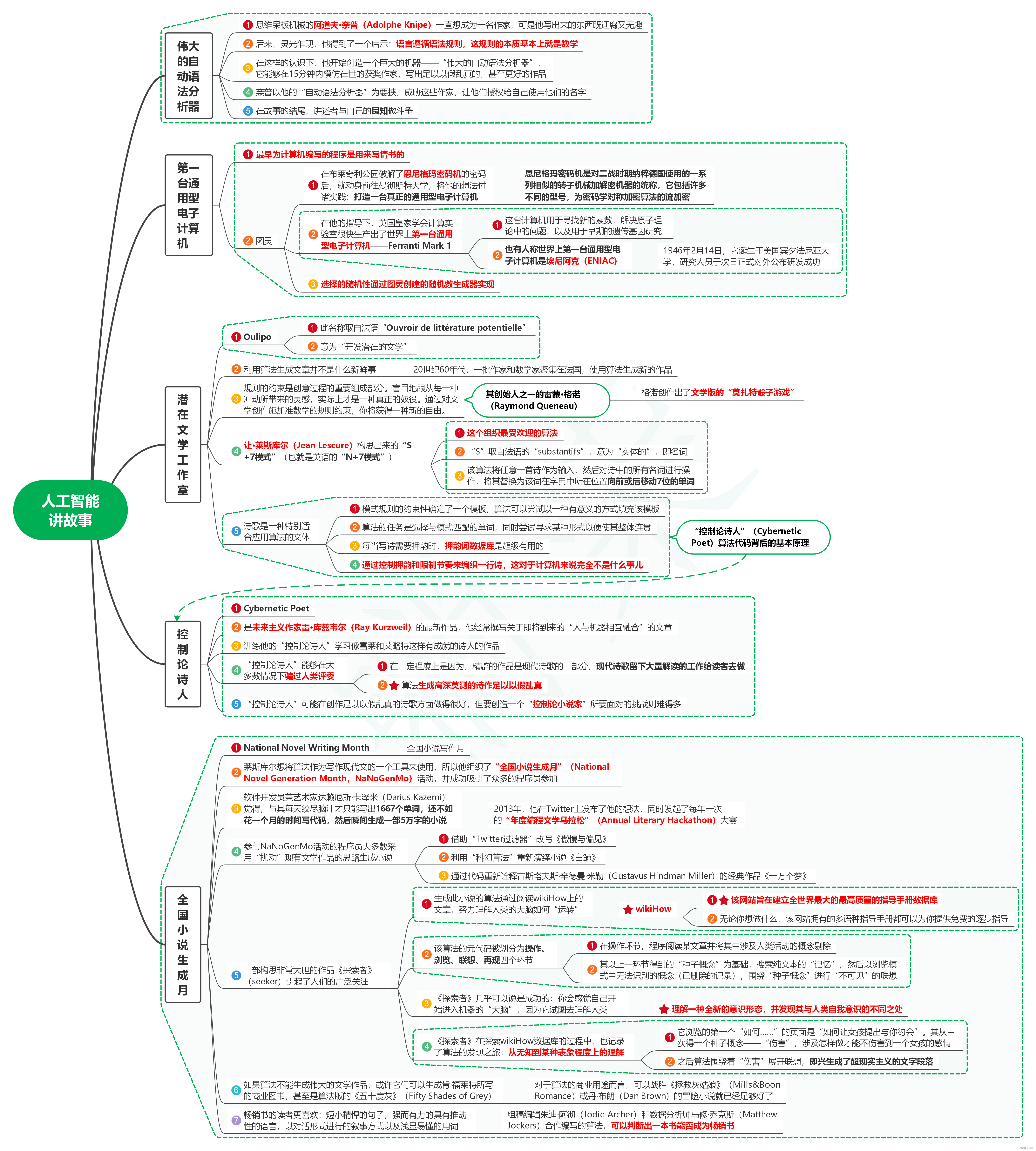 1. 伟大的自动语法分析器 1.1. 思维呆板机械的阿道夫·奈普(Adolphe Knipe)一直想成为一名作家,可是他写出来的东西既迂腐又无趣 1.2. 后来,灵光乍现,他得到了一个启示:语言遵循语法规则,这规则的本质基本上就是数学 1.3. 在这样的认识下,他开始创造一个巨大的机器——“伟大的自动语法分析器”,它能够在15分钟内模仿在世的获奖作家,写出足以以假乱真的,甚至更好的作品 1.4. 奈普以他的“自动语法分析器”为要挟,威胁这些作家,让他们授权给自己使用他们的名字 1.5. 在故事的结尾,讲述者与自己的良知做斗争 2. 第一台通用型电子计算机 2.1. 最早为计算机编写的程序是用来写情书的 2.2. 图灵 2.2.1. 在布莱奇利公园破解了恩尼格玛密码机的密码后,就动身前往曼彻斯特大学,将他的想法付诸实践:打造一台真正的通用型电子计算机 2.2.1.1. 恩尼格玛密码机是对二战时期纳粹德国使用的一系列相似的转子机械加解密机器的统称,它包括许多不同的型号,为密码学对称加密算法的流加密 2.2.2. 在他的指导下,英国皇家学会计算实验室很快生产出了世界上第一台通用型电子计算机——Ferranti Mark 1 2.2.2.1. 这台计算机用于寻找新的素数,解决原子理论中的问题,以及用于早期的遗传基因研究 2.2.2.2. 也有人称世界上第一台通用型电子计算机是埃尼阿克(ENIAC) 2.2.2.2.1. 1946年2月14日,它诞生于美国宾夕法尼亚大学,研究人员于次日正式对外公布研发成功 2.2.3. 选择的随机性通过图灵创建的随机数生成器实现 3. 潜在文学工作室 3.1. Oulipo 3.1.1. 此名称取自法语“Ouvroir de littérature potentielle” 3.1.2. 意为“开发潜在的文学” 3.2. 利用算法生成文章并不是什么新鲜事 3.2.1. 20世纪60年代,一批作家和数学家聚集在法国,使用算法生成新的作品 3.3. 规则的约束是创意过程的重要组成部分。盲目地跟从每一种冲动所带来的灵感,实际上才是一种真正的奴役。通过对文学创作施加准数学的规则约束,你将获得一种新的自由。 3.3.1. 其创始人之一的雷蒙·格诺(Raymond Queneau) 3.3.1.1. 格诺创作出了文学版的“莫扎特骰子游戏” 3.4. 让·莱斯库尔(Jean Lescure)构思出来的“S+7模式”(也就是英语的“N+7模式”) 3.4.1. 这个组织最受欢迎的算法 3.4.2. “S”取自法语的“substantifs”,意为“实体的”,即名词 3.4.3. 该算法将任意一首诗作为输入,然后对诗中的所有名词进行操作,将其替换为该词在字典中所在位置向前或后移动7位的单词 3.5. 诗歌是一种特别适合应用算法的文体 3.5.1. 模式规则的约束性确定了一个模板,算法可以尝试以一种有意义的方式填充该模板 3.5.2. 算法的任务是选择与模式匹配的单词,同时尝试寻求某种形式以便使其整体连贯 3.5.3. 每当写诗需要押韵时,押韵词数据库是超级有用的 3.5.4. 通过控制押韵和限制节奏来编织一行诗,这对于计算机来说完全不是什么事儿 3.5.5. “控制论诗人”(Cybernetic Poet)算法代码背后的基本原理 4. 控制论诗人 4.1. Cybernetic Poet 4.2. 是未来主义作家雷·库兹韦尔(Ray Kurzweil)的最新作品,他经常撰写关于即将到来的“人与机器相互融合”的文章 4.3. 训练他的“控制论诗人”学习像雪莱和艾略特这样有成就的诗人的作品 4.4. “控制论诗人”能够在大多数情况下骗过人类评委 4.4.1. 在一定程度上是因为,精辟的作品是现代诗歌的一部分,现代诗歌留下大量解读的工作给读者去做 4.4.2. 算法生成高深莫测的诗作足以以假乱真 4.5. “控制论诗人”可能在创作足以以假乱真的诗歌方面做得很好,但要创造一个“控制论小说家”所要面对的挑战则难得多 5. 全国小说生成月 5.1. National Novel Writing Month 5.1.1. 全国小说写作月 5.2. 莱斯库尔想将算法作为写作现代文的一个工具来使用,所以他组织了“全国小说生成月”(National Novel Generation Month,NaNoGenMo)活动,并成功吸引了众多的程序员参加 5.3. 软件开发员兼艺术家达莱厄斯·卡泽米(Darius Kazemi)觉得,与其每天绞尽脑汁才只能写出1667个单词,还不如花一个月的时间写代码,然后瞬间生成一部5万字的小说 5.3.1. 2013年,他在Twitter上发布了他的想法,同时发起了每年一次的“年度编程文学马拉松”(Annual Literary Hackathon)大赛 5.4. 参与NaNoGenMo活动的程序员大多数采用“扰动”现有文学作品的思路生成小说 5.4.1. 借助“Twitter过滤器”改写《傲慢与偏见》 5.4.2. 利用“科幻算法”重新演绎小说《白鲸》 5.4.3. 通过代码重新诠释古斯塔夫斯·辛德曼·米勒(Gustavus Hindman Miller)的经典作品《一万个梦》 5.5. 一部构思非常大胆的作品《探索者》(seeker)引起了人们的广泛关注 5.5.1. 生成此小说的算法通过阅读wikiHow上的文章,努力理解人类的大脑如何“运转” 5.5.1.1. wikiHow 5.5.1.1.1. 该网站旨在建立全世界最大的最高质量的指导手册数据库 5.5.1.1.2. 无论你想做什么,该网站拥有的多语种指导手册都可以为你提供免费的逐步指导 5.5.2. 该算法的元代码被划分为操作、浏览、联想、再现四个环节 5.5.2.1. 在操作环节,程序阅读某文章并将其中涉及人类活动的概念剔除 5.5.2.2. 其以上一环节得到的“种子概念”为基础,搜索纯文本的“记忆”,然后以浏览模式中无法识别的概念(已删除的记录),围绕“种子概念”进行“不可见”的联想 5.5.3. 《探索者》几乎可以说是成功的:你会感觉自己开始进入机器的“大脑”,因为它试图去理解人类 5.5.3.1. 理解一种全新的意识形态,