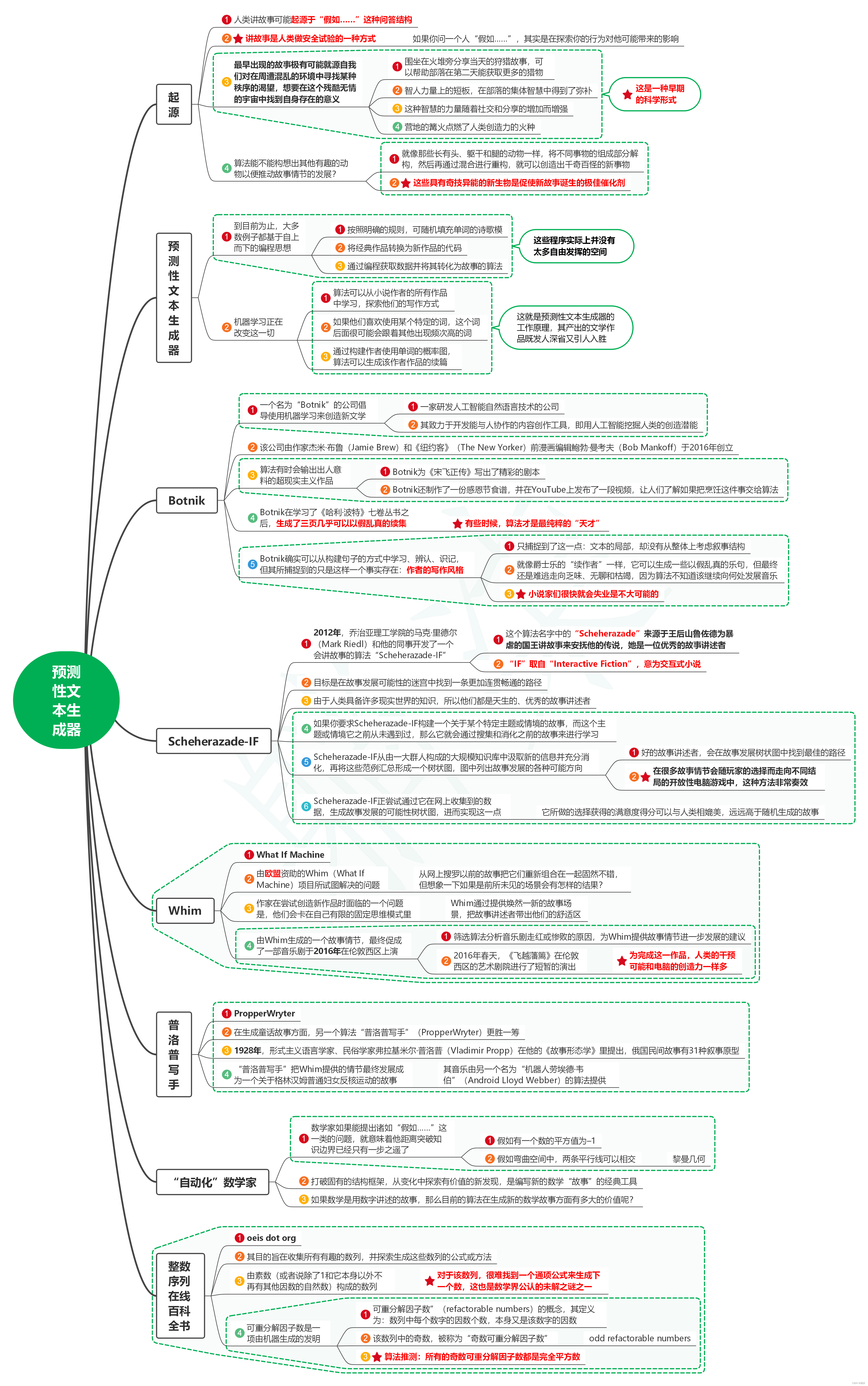 1. 起源 1.1. 人类讲故事可能起源于“假如……”这种问答结构 1.2. 讲故事是人类做安全试验的一种方式 1.2.1. 如果你问一个人“假如……”,其实是在探索你的行为对他可能带来的影响 1.3. 最早出现的故事极有可能就源自我们对在周遭混乱的环境中寻找某种秩序的渴望,想要在这个残酷无情的宇宙中找到自身存在的意义 1.3.1. 围坐在火堆旁分享当天的狩猎故事,可以帮助部落在第二天能获取更多的猎物 1.3.2. 智人力量上的短板,在部落的集体智慧中得到了弥补 1.3.3. 这种智慧的力量随着社交和分享的增加而增强 1.3.4. 营地的篝火点燃了人类创造力的火种 1.3.5. 这是一种早期的科学形式 1.4. 算法能不能构想出其他有趣的动物以便推动故事情节的发展? 1.4.1. 就像那些长有头、躯干和腿的动物一样,将不同事物的组成部分解构,然后再通过混合进行重构,就可以创造出千奇百怪的新事物 1.4.2. 这些具有奇技异能的新生物是促使新故事诞生的极佳催化剂 2. 预测性文本生成器 2.1. 到目前为止,大多数例子都基于自上而下的编程思想 2.1.1. 按照明确的规则,可随机填充单词的诗歌模 2.1.2. 将经典作品转换为新作品的代码 2.1.3. 通过编程获取数据并将其转化为故事的算法 2.1.4. 这些程序实际上并没有太多自由发挥的空间 2.2. 机器学习正在改变这一切 2.2.1. 算法可以从小说作者的所有作品中学习,探索他们的写作方式 2.2.2. 如果他们喜欢使用某个特定的词,这个词后面很可能会跟着其他出现频次高的词 2.2.3. 通过构建作者使用单词的概率图,算法可以生成该作者作品的续篇 2.2.4. 这就是预测性文本生成器的工作原理,其产出的文学作品既发人深省又引人入胜 3. Botnik 3.1. 一个名为“Botnik”的公司倡导使用机器学习来创造新文学 3.1.1. 一家研发人工智能自然语言技术的公司 3.1.2. 其致力于开发能与人协作的内容创作工具,即用人工智能挖掘人类的创造潜能 3.2. 该公司由作家杰米·布鲁(Jamie Brew)和《纽约客》(The New Yorker)前漫画编辑鲍勃·曼考夫(Bob Mankoff)于2016年创立 3.3. 算法有时会输出出人意料的超现实主义作品 3.3.1. Botnik为《宋飞正传》写出了精彩的剧本 3.3.2. Botnik还制作了一份感恩节食谱,并在YouTube上发布了一段视频,让人们了解如果把烹饪这件事交给算法 3.4. Botnik在学习了《哈利·波特》七卷丛书之后,生成了三页几乎可以以假乱真的续集 3.4.1. 有些时候,算法才是最纯粹的“天才” 3.5. Botnik确实可以从构建句子的方式中学习、辨认、识记,但其所捕捉到的只是这样一个事实存在:作者的写作风格 3.5.1. 只捕捉到了这一点:文本的局部,却没有从整体上考虑叙事结构 3.5.2. 就像爵士乐的“续作者”一样,它可以生成一些以假乱真的乐句,但最终还是难逃走向乏味、无聊和枯竭,因为算法不知道该继续向何处发展音乐 3.5.3. 小说家们很快就会失业是不大可能的 4. Scheherazade-IF 4.1. 2012年,乔治亚理工学院的马克·里德尔(Mark Riedl)和他的同事开发了一个会讲故事的算法“Scheherazade-IF” 4.1.1. 这个算法名字中的“Scheherazade”来源于王后山鲁佐德为暴虐的国王讲故事来安抚他的传说,她是一位优秀的故事讲述者 4.1.2. “IF”取自“Interactive Fiction”,意为交互式小说 4.2. 目标是在故事发展可能性的迷宫中找到一条更加连贯畅通的路径 4.3. 由于人类具备许多现实世界的知识,所以他们都是天生的、优秀的故事讲述者 4.4. 如果你要求Scheherazade-IF构建一个关于某个特定主题或情境的故事,而这个主题或情境它之前从未遇到过,那么它就会通过搜集和消化之前的故事来进行学习 4.5. Scheherazade-IF从由一大群人构成的大规模知识库中汲取新的信息并充分消化,再将这些范例汇总形成一个树状图,图中列出故事发展的各种可能方向 4.5.1. 好的故事讲述者,会在故事发展树状图中找到最佳的路径 4.5.2. 在很多故事情节会随玩家的选择而走向不同结局的开放性电脑游戏中,这种方法非常奏效 4.6. Scheherazade-IF正尝试通过它在网上收集到的数据,生成故事发展的可能性树状图,进而实现这一点 4.6.1. 它所做的选择获得的满意度得分可以与人类相媲美,远远高于随机生成的故事 5. Whim 5.1. What If Machine 5.2. 由欧盟资助的Whim(What If Machine)项目所试图解决的问题 5.2.1. 从网上搜罗以前的故事把它们重新组合在一起固然不错,但想象一下如果是前所未见的场景会有怎样的结果? 5.3. 作家在尝试创造新作品时面临的一个问题是,他们会卡在自己有限的固定思维模式里 5.3.1. Whim通过提供焕然一新的故事场景,把故事讲述者带出他们的舒适区 5.4. 由Whim生成的一个故事情节,最终促成了一部音乐剧于2016年在伦敦西区上演 5.4.1. 筛选算法分析音乐剧走红或惨败的原因,为Whim提供故事情节进一步发展的建议 5.4.2. 2016年春天,《飞越藩篱》在伦敦西区的艺术剧院进行了短暂的演出 5.4.2.1. 为完成这一作品,人类的干预可能和电脑的创造力一样多 6. 普洛普写手 6.1. PropperWryter 6.2. 在生成童话故事方面,另一个算法“普洛普写手”(PropperWryter)更胜一筹 6.3. 1928年,形式主义语言学家、民俗学家弗拉基米尔·普洛普(Vladimir Propp)在他的《故事形态学》里提出,俄国民间故事有31种叙事原型 6.4. “普洛普写手”把Whim提供的情节最终发展成为一个关于格林汉姆普通妇女反核运动的故事 6.4.1. 其音乐由另一个名为“机器人劳埃德·韦伯”(Android Lloyd 