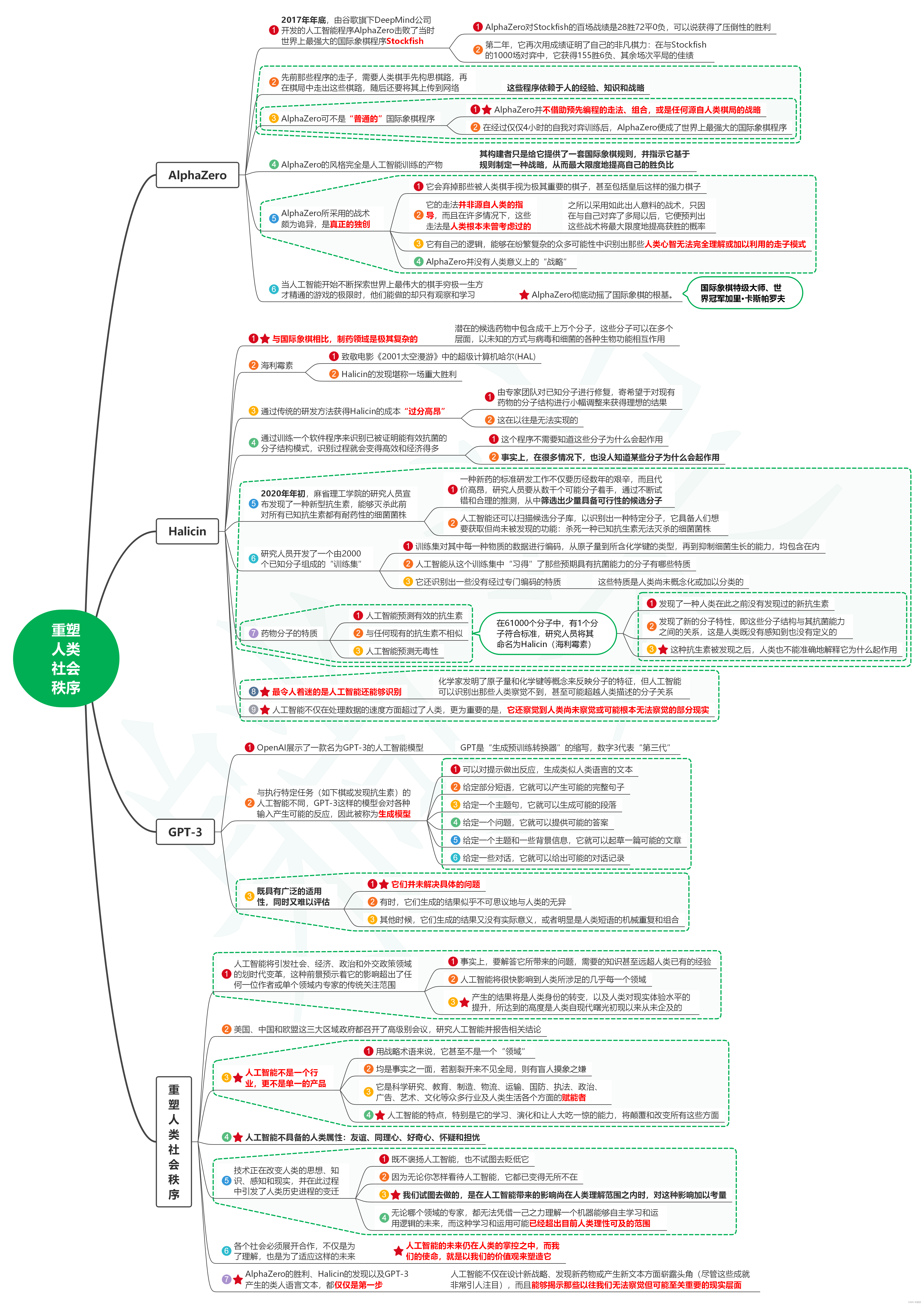 1. AlphaZero 1.1. 2017年年底,由谷歌旗下DeepMind公司开发的人工智能程序AlphaZero击败了当时世界上最强大的国际象棋程序Stockfish 1.1.1. AlphaZero对Stockfish的百场战绩是28胜72平0负,可以说获得了压倒性的胜利 1.1.2. 第二年,它再次用成绩证明了自己的非凡棋力:在与Stockfish的1000场对弈中,它获得155胜6负、其余场次平局的佳绩 1.2. 先前那些程序的走子,需要人类棋手先构思棋路,再在棋局中走出这些棋路,随后还要将其上传到网络 1.2.1. 这些程序依赖于人的经验、知识和战略 1.3. AlphaZero可不是“普通的”国际象棋程序 1.3.1. AlphaZero并不借助预先编程的走法、组合,或是任何源自人类棋局的战略 1.3.2. 在经过仅仅4小时的自我对弈训练后,AlphaZero便成了世界上最强大的国际象棋程序 1.4. AlphaZero的风格完全是人工智能训练的产物 1.4.1. 其构建者只是给它提供了一套国际象棋规则,并指示它基于规则制定一种战略,从而最大限度地提高自己的胜负比 1.5. AlphaZero所采用的战术颇为诡异,是真正的独创 1.5.1. 它会弃掉那些被人类棋手视为极其重要的棋子,甚至包括皇后这样的强力棋子 1.5.2. 它的走法并非源自人类的指导,而且在许多情况下,这些走法是人类根本未曾考虑过的 1.5.2.1. 之所以采用如此出人意料的战术,只因在与自己对弈了多局以后,它便预判出这些战术将最大限度地提高获胜的概率 1.5.3. 它有自己的逻辑,能够在纷繁复杂的众多可能性中识别出那些人类心智无法完全理解或加以利用的走子模式 1.5.4. AlphaZero并没有人类意义上的“战略” 1.6. 当人工智能开始不断探索世界上最伟大的棋手穷极一生方才精通的游戏的极限时,他们能做的却只有观察和学习 1.6.1. AlphaZero彻底动摇了国际象棋的根基。 1.6.1.1. 国际象棋特级大师、世界冠军加里·卡斯帕罗夫 2. Halicin 2.1. 与国际象棋相比,制药领域是极其复杂的 2.1.1. 潜在的候选药物中包含成千上万个分子,这些分子可以在多个层面,以未知的方式与病毒和细菌的各种生物功能相互作用 2.2. 海利霉素 2.2.1. 致敬电影《2001太空漫游》中的超级计算机哈尔(HAL) 2.2.2. Halicin的发现堪称一场重大胜利 2.3. 通过传统的研发方法获得Halicin的成本“过分高昂” 2.3.1. 由专家团队对已知分子进行修复,寄希望于对现有药物的分子结构进行小幅调整来获得理想的结果 2.3.2. 这在以往是无法实现的 2.4. 通过训练一个软件程序来识别已被证明能有效抗菌的分子结构模式,识别过程就会变得高效和经济得多 2.4.1. 这个程序不需要知道这些分子为什么会起作用 2.4.2. 事实上,在很多情况下,也没人知道某些分子为什么会起作用 2.5. 2020年年初,麻省理工学院的研究人员宣布发现了一种新型抗生素,能够灭杀此前对所有已知抗生素都有耐药性的细菌菌株 2.5.1. 一种新药的标准研发工作不仅要历经数年的艰辛,而且代价高昂,研究人员要从数千个可能分子着手,通过不断试错和合理的推测,从中筛选出少量具备可行性的候选分子 2.5.2. 人工智能还可以扫描候选分子库,以识别出一种特定分子,它具备人们想要获取但尚未被发现的功能:杀死一种已知抗生素无法灭杀的细菌菌株 2.6. 研究人员开发了一个由2000个已知分子组成的“训练集” 2.6.1. 训练集对其中每一种物质的数据进行编码,从原子量到所含化学键的类型,再到抑制细菌生长的能力,均包含在内 2.6.2. 人工智能从这个训练集中“习得”了那些预期具有抗菌能力的分子有哪些特质 2.6.3. 它还识别出一些没有经过专门编码的特质 2.6.3.1. 这些特质是人类尚未概念化或加以分类的 2.7. 药物分子的特质 2.7.1. 人工智能预测有效的抗生素 2.7.2. 与任何现有的抗生素不相似 2.7.3. 人工智能预测无毒性 2.7.4. 在61000个分子中,有1个分子符合标准,研究人员将其命名为Halicin(海利霉素) 2.7.4.1. 发现了一种人类在此之前没有发现过的新抗生素 2.7.4.2. 发现了新的分子特性,即这些分子结构与其抗菌能力之间的关系,这是人类既没有感知到也没有定义的 2.7.4.3. 这种抗生素被发现之后,人类也不能准确地解释它为什么起作用 2.8. 最令人着迷的是人工智能还能够识别 2.8.1. 化学家发明了原子量和化学键等概念来反映分子的特征,但人工智能可以识别出那些人类察觉不到,甚至可能超越人类描述的分子关系 2.9. 人工智能不仅在处理数据的速度方面超过了人类,更为重要的是,它还察觉到人类尚未察觉或可能根本无法察觉的部分现实 3. GPT-3 3.1. OpenAI展示了一款名为GPT-3的人工智能模型 3.1.1. GPT是“生成预训练转换器”的缩写,数字3代表“第三代” 3.2. 与执行特定任务(如下棋或发现抗生素)的人工智能不同,GPT-3这样的模型会对各种输入产生可能的反应,因此被称为生成模型 3.2.1. 可以对提示做出反应,生成类似人类语言的文本 3.2.2. 给定部分短语,它就可以产生可能的完整句子 3.2.3. 给定一个主题句,它就可以生成可能的段落 3.2.4. 给定一个问题,它就可以提供可能的答案 3.2.5. 给定一个主题和一些背景信息,它就可以起草一篇可能的文章 3.2.6. 给定一些对话,它就可以给出可能的对话记录 3.3. 既具有广泛的适用性,同时又难以评估 3.3.1. 它们并未解决具体的问题 3.3.2. 有时,它们生成的结果似乎不可思议地与人类的无异 3.3.3. 其他时候,它们生成的结果又没有实际意义,或者明显是人类短语的机械重复和组合 4. 重塑人类社会秩序 4.1. 人工智能将引发社