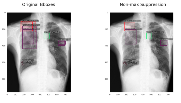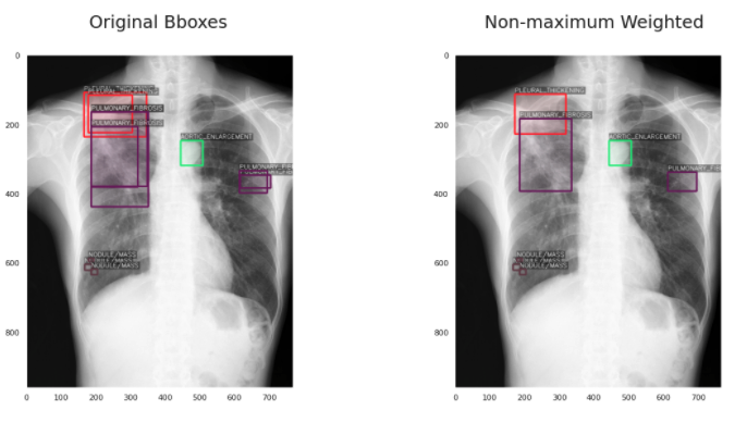 第一个问题是,这些疾病是由多个不同的放射科医生标记的,对于同一种异常可能有多个不同的边界框。所以我们必须过滤这些(或者在本例中“融合”它们),以避免混淆我们的模型。