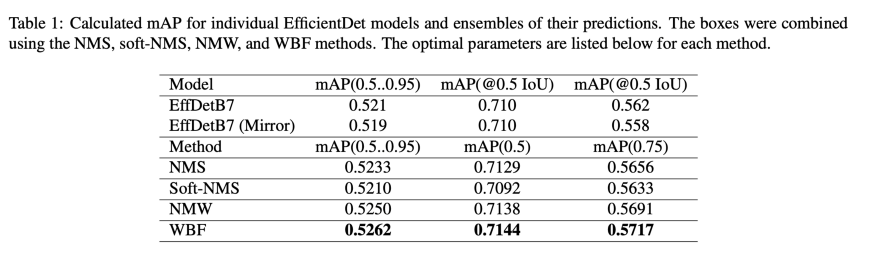 如果你想尝试其他方法,你可以将“weighted_boxes_fusion”替换为“nms”或“soft_nms”,或“non_maxmimum_weighted”,它会工作得很好。我发现这个库/技术的最初原因是,在Kaggle的VinBigData竞赛中,数据集存在两个主要问题,导致物体检测模型性能不佳。