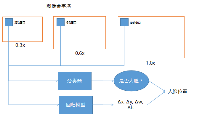 上面画的三个窗口,一个是0.3倍、0.6倍、1.0倍,当人脸位置不定,大小无法识别时可采用此技术,让这个图本身变得大小不同,而滑动窗口的大小相同。深度网络一般输入的图象大小是固定的,那么前面的滑动窗口基本上也是固定的。为了让固定的滑动窗口能够覆盖不同的范围的话,就对整个图的大小进行缩放,取不同的比例。这边画0.3、0.6、1.0只是举例,实际用的时候还可以有很多其他不同的倍数。