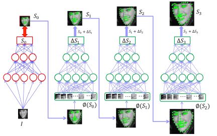 即做多次输入,第一次输入这个网络以后先做一次推测,这个推测是一个可接受的不那么精确的推测,大概知道人脸的五个点在哪。然后把这五个点和那张原图放到第二个网络里面去,得到大概的修正量,有了一个基础五个点以后再求修正量的话会比直接从原图上面找精确的五个点要稍微容易一些。所以用这种逐步求精的方式用多个网络级联在一起就能够做到一个速度跟精度的比较好的平衡,实际现在做的时候基本上用两层就大概差不多了。