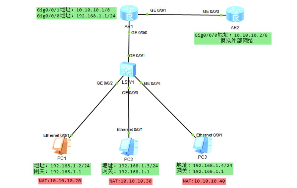 [R1] nat address-group 1 10.10.10.20 10.10.10.40 // 创建公网地址池