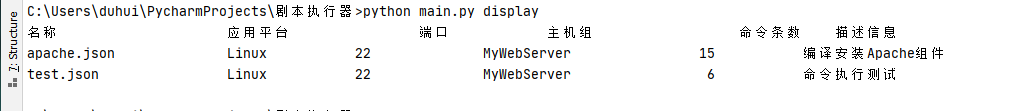 我们首先可以执行main.py display命令,获取当前设备中的所有剧本信息。